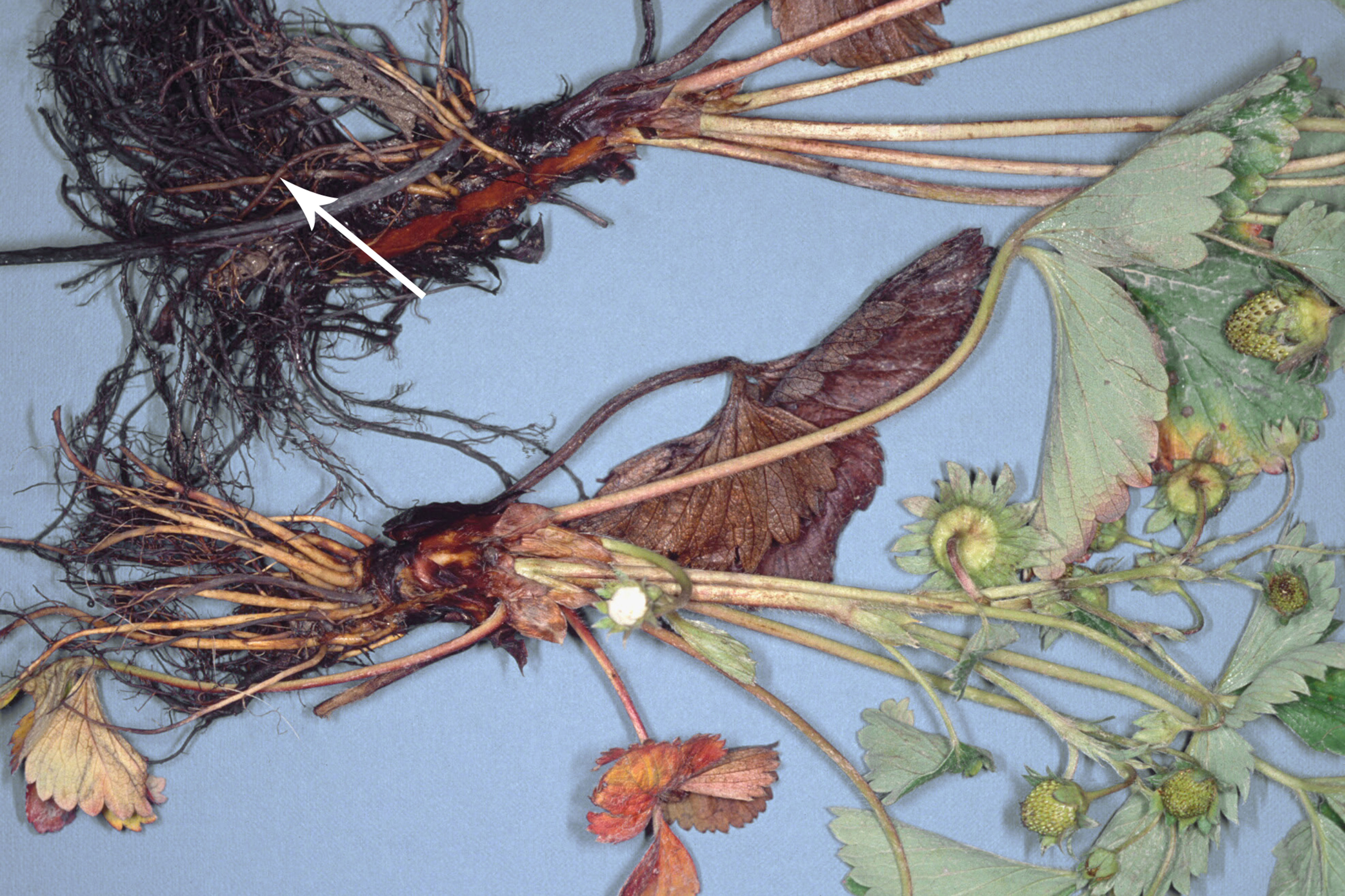 Comparaison entre un système racinaire de fraisier sain et affecté