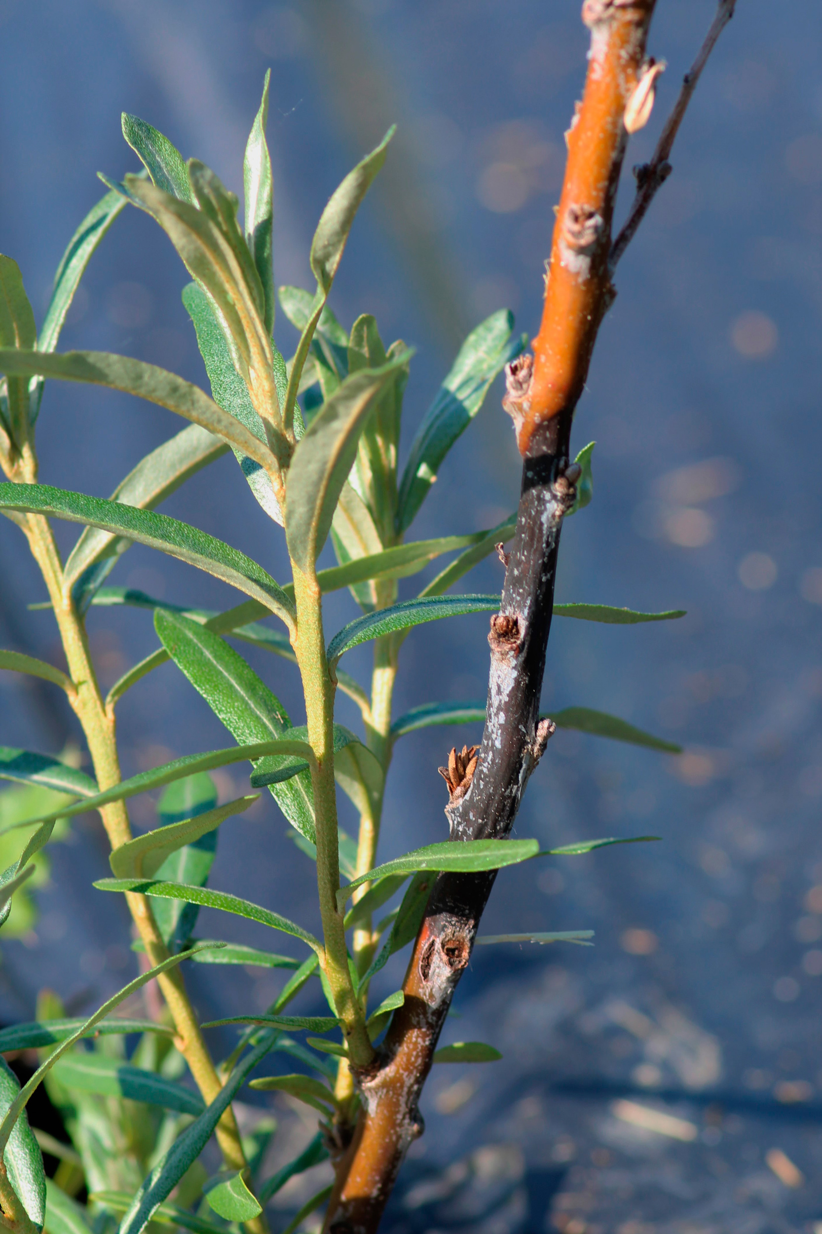 Le chancre présent sur le jeune plant d’argousier est causé par Phompsis sp. L’écorce est assombrie, affaissée et sèche. La partie supérieure au chancre de la tige dépérit.