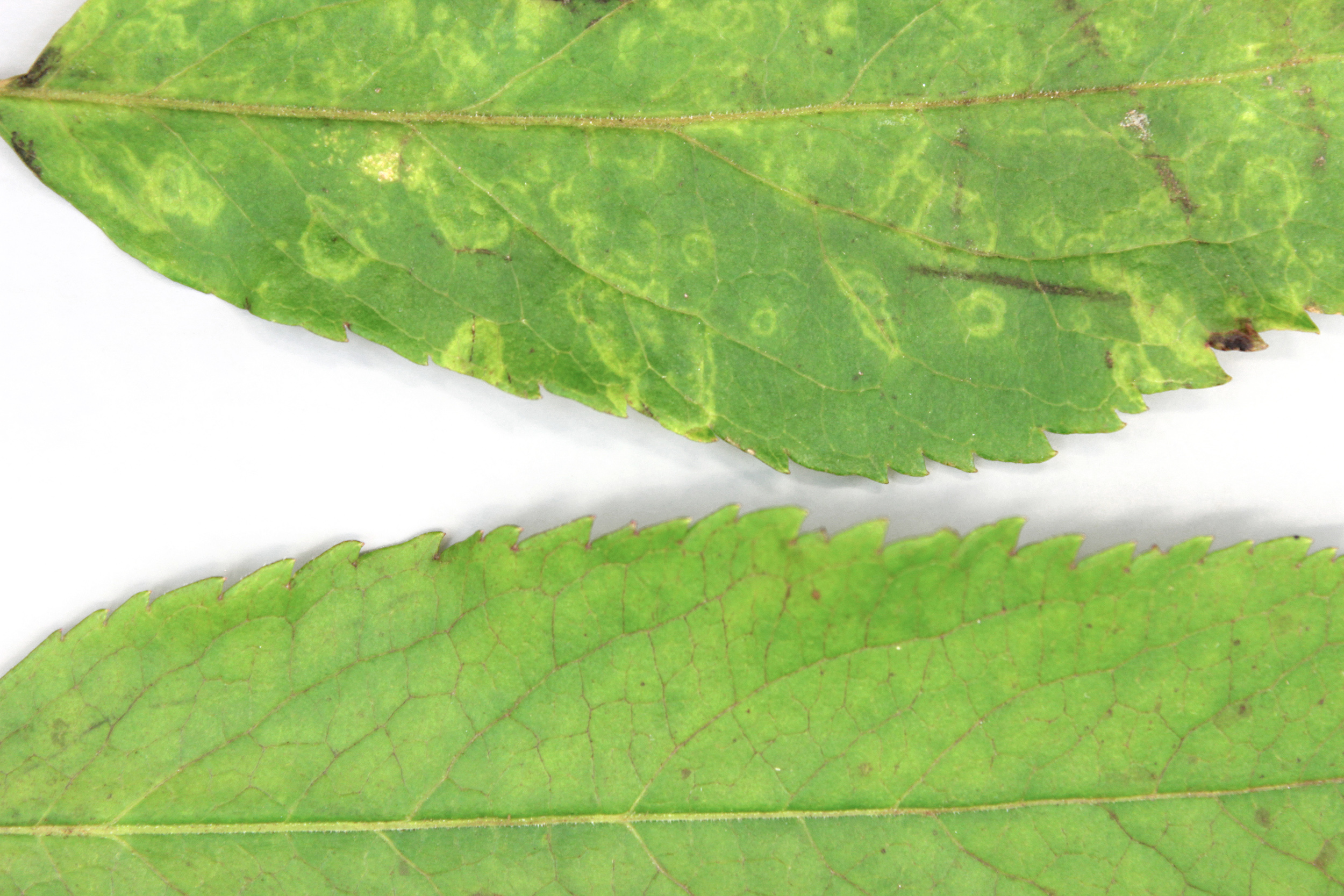 Comparaison entre une feuille de sureau saine et affectée. La feuille infectée montre une mosaïque, des anneaux, des marbrures et des lignes jaunes sur le limbe. La majorité des feuilles basales et médianes présentaient ces symptômes. Les tests de laboratoire (test ELISA) se sont avérés négatifs pour la détection de virus (19 virus testés). Malgré le résultat négatif des tests effectués, il est plausible de croire que ces symptômes sont liés à une infection virale. Il pourrait s'agir d'une infection liée à un virus pour lequel nous ne disposons pas d'anticorps. Nous ne pourrons préciser la nature du virus en cause.