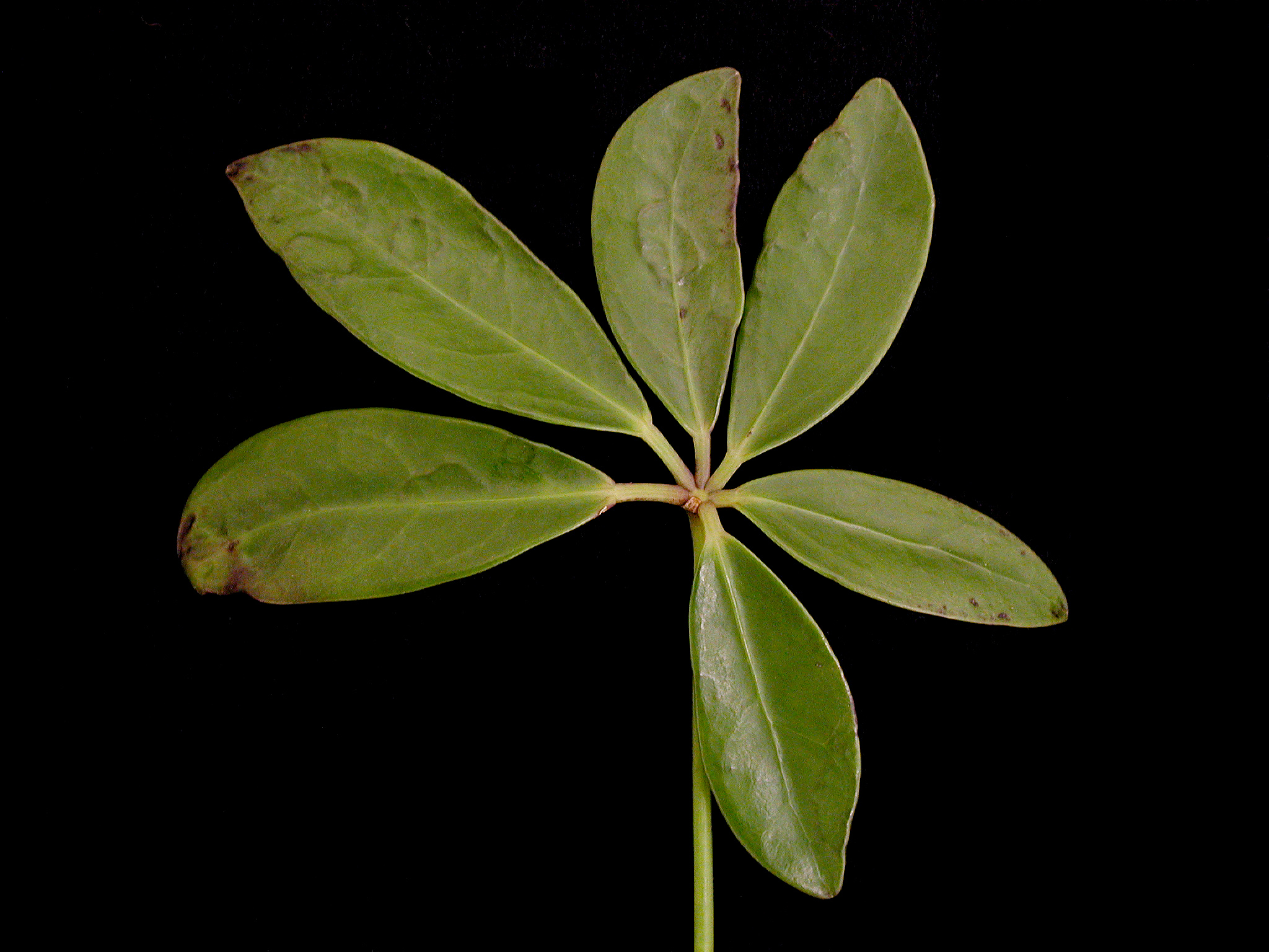 La face supérieure des feuilles atteintes montre la marque d'anneaux présents à la face inférieure. Ces anneaux sont brun foncé et mesurent entre 1 et 10 mm de diamètre. Ils sont au nombre de 5 à 15 par feuille. La détection de virus s’est avérée négative pour les virus suivants : AMV, CMV, INSV, TMV, TSWV et Potyvirus. Malgré le résultat des tests, les symptômes indiquent qu’il pourrait s’agir tout de même d’une virose. Il pourrait s’agir d’un virus moins fréquent pour lequel nous ne possédons pas l’anticorps. La littérature mentionne le ‘Schefflera ringspot virus’ (SRV) ou le ‘Ghost virus’. Le SRV ressemble en tout point au ‘Agave ringspot virus’.
