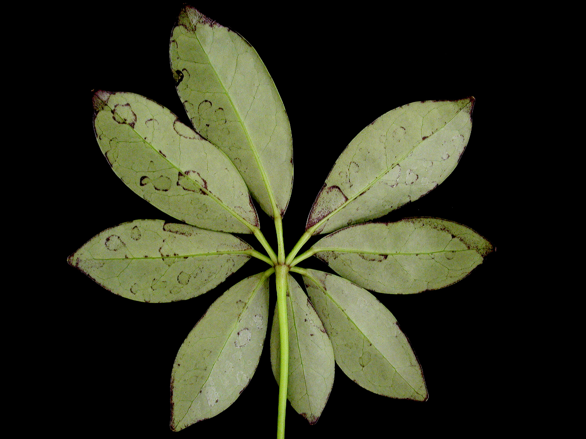 À la face inférieure des feuilles, présence de minces anneaux brun foncé. Ces anneaux mesurent entre 1 et 10 mm de diamètre et sont au nombre de 5 à 15 par feuille. La face supérieure des feuilles atteintes montre la marque de ces anneaux (« anneau fantôme ») (non visible sur cette image). La détection de virus s’est avérée négative pour les virus suivants : AMV, CMV, INSV, TMV, TSWV et Potyvirus. Malgré le résultat des tests, les symptômes indiquent qu’il pourrait s’agir tout de même d’une virose. Il pourrait s’agir d’un virus moins fréquent pour lequel nous ne possédons pas l’anticorps. La littérature mentionne le ‘Schefflera ringspot virus’ (SRV) ou le ‘Ghost virus’. Le SRV ressemble en tout point au ‘Agave ringspot virus’.