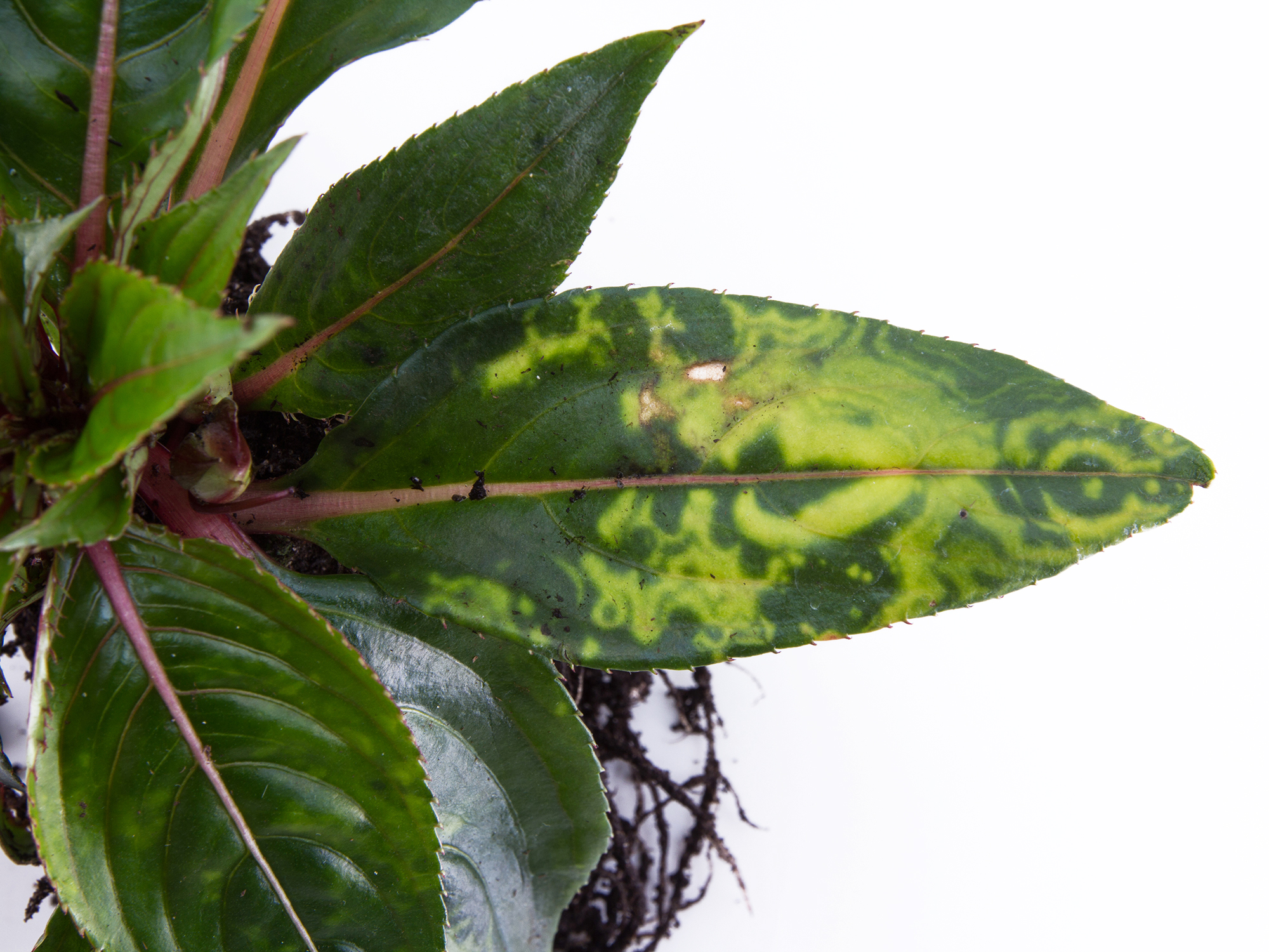 Une vue rapprochée d’une feuille d’impatiente de Nouvelle-Guinée (cv 'Celebrette Pink') montre des marbrures sur les feuilles. Des anneaux sont présents dans les régions qui portent des marbrures. Les feuilles basales et médianes sont affectées. Les tests de laboratoire (test ELISA) se sont avérés négatifs pour la détection de virus (19 virus testés). Seuls quelques plants de cette variété avaient ces symptômes.
