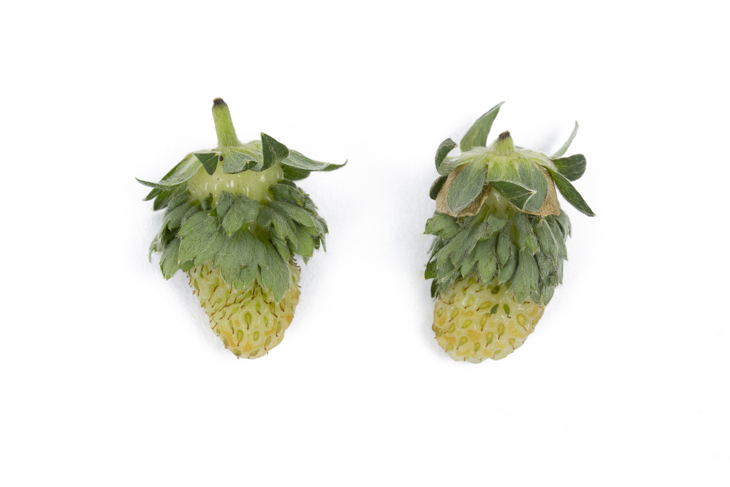 Sur ces fraises (cv 'Albion'), on observe une croissance foliacée à partir des akènes du fruit. Puisqu’aucun phytoplasme n’a été détecté, il est fort probable qu’il s’agisse de phyllodie non parasitaire.