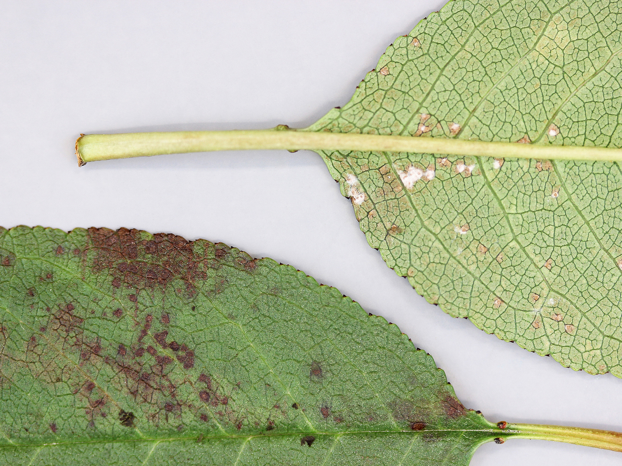 À gauche, de nombreuses petites taches circulaires d’environ 3 mm et de couleur brun pourpre se sont développées sur la face supérieure de cette feuille de cerisier nain rustique, à la suite d'une infection par Blumeriella jaapii.