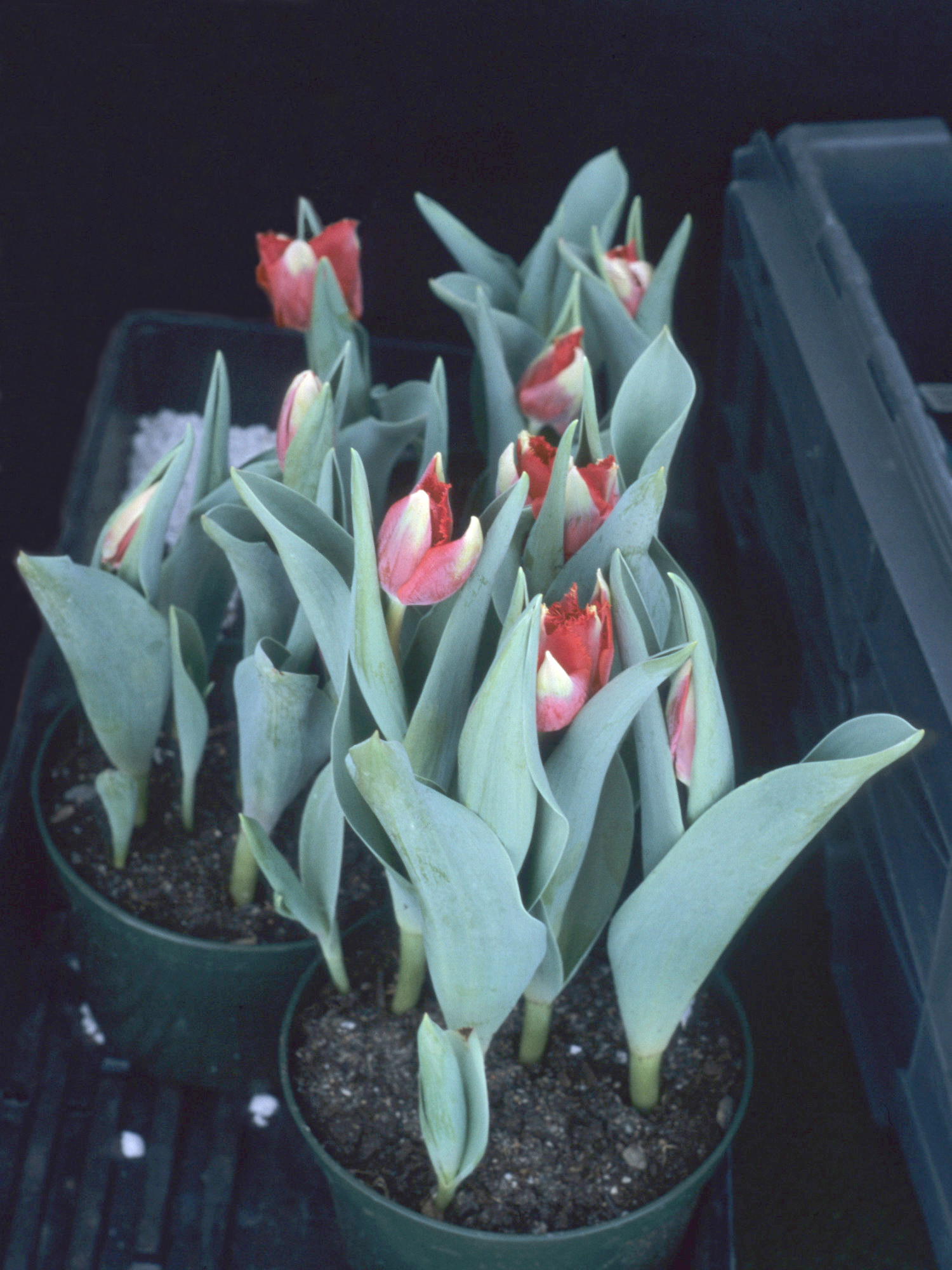 Sur cette image, les fleurs développent des pétales blanchâtres à verdâtres et des pétales normaux, mais plus petits. Chez la tulipe, ce phénomène est connu sous le nom de « topple » des tulipes. Il est dû à une période de vernalisation (froid) trop courte en chambre froide.