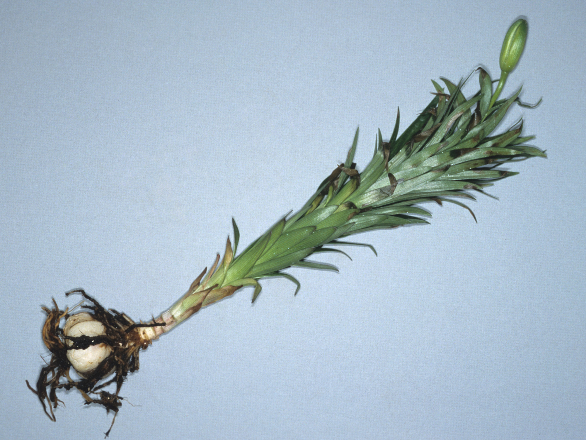 Les feuilles situées dans la moitié supérieure du plant présentent un dessèchement de l'apex et des taches sur le limbe. Les feuilles basales sont saines. Les racines en dessous du bulbe sont ramollies et celles au-dessus sont saines. Les tests de laboratoire se sont avérés négatifs (champignons, bactéries).