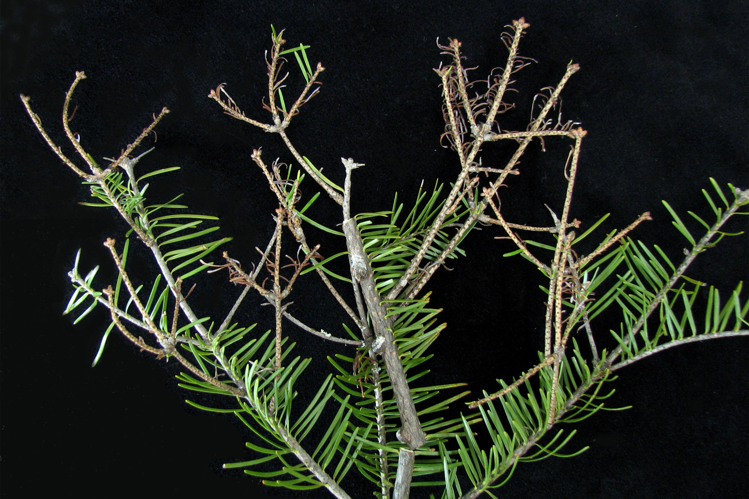 Symptôme de la brûlure des pousses causée par Delphinella abietis.