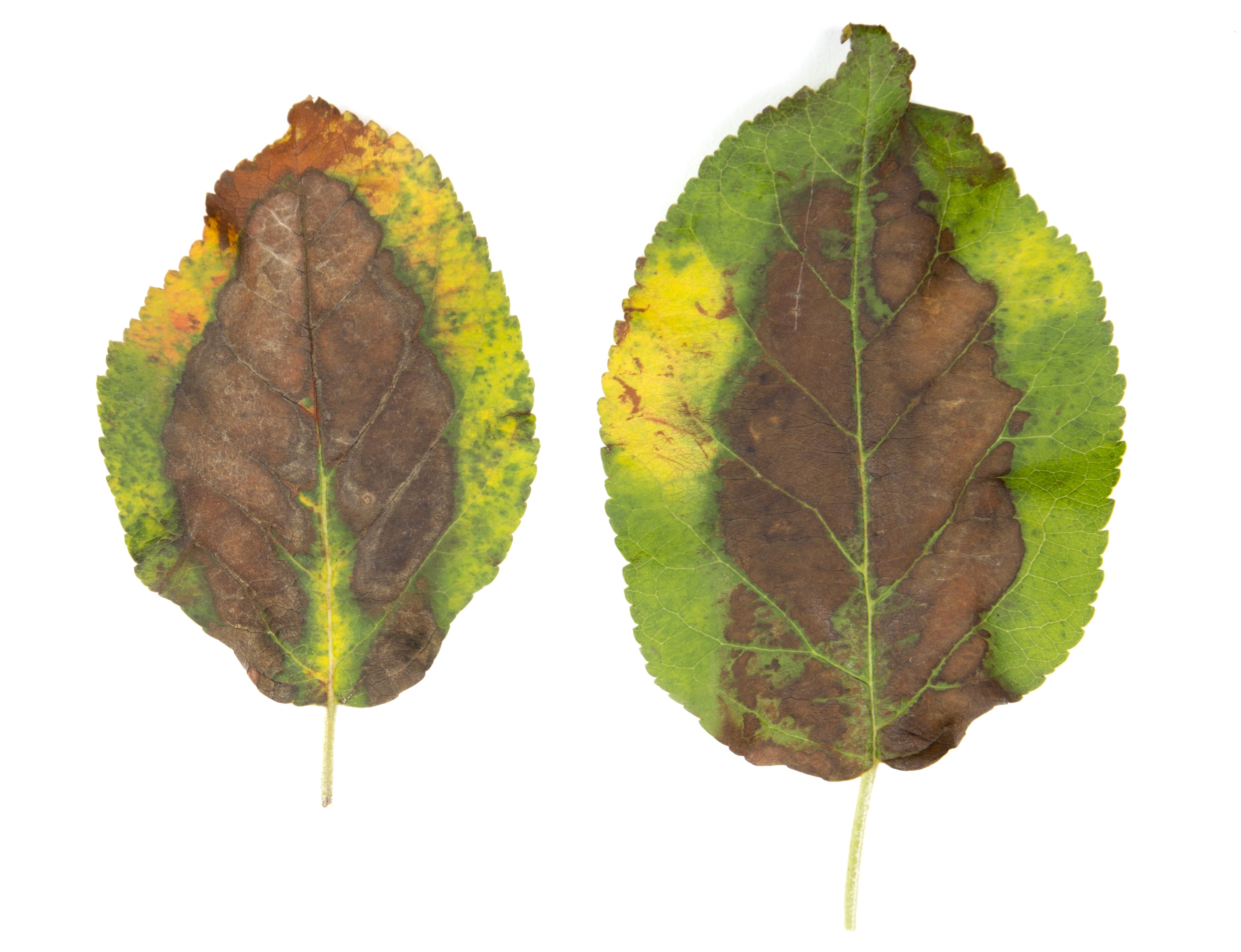 Sur des feuilles de pommier du cv McIntosh, un jaunissement est présent à la marge de la feuille alors qu'un brunissement important (brûlure) s'étend de part et d'autre de la nervure centrale. Les nervures restent en partie vertes. Les brûlures qui demeurent souples sont aussi apparentes à la face adaxiale.