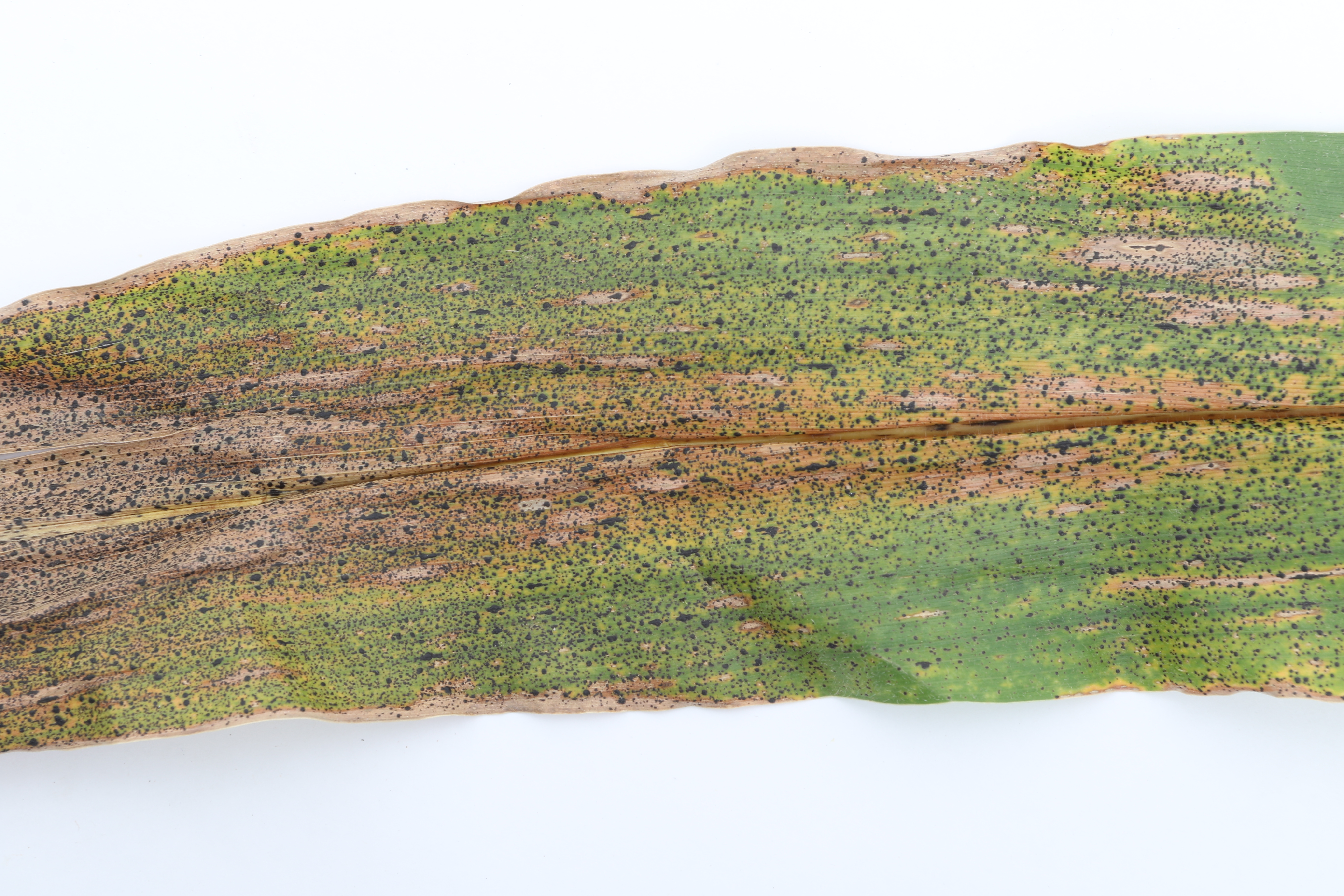 Symptôme de la tache goudronneuse sur une feuille de maïs.