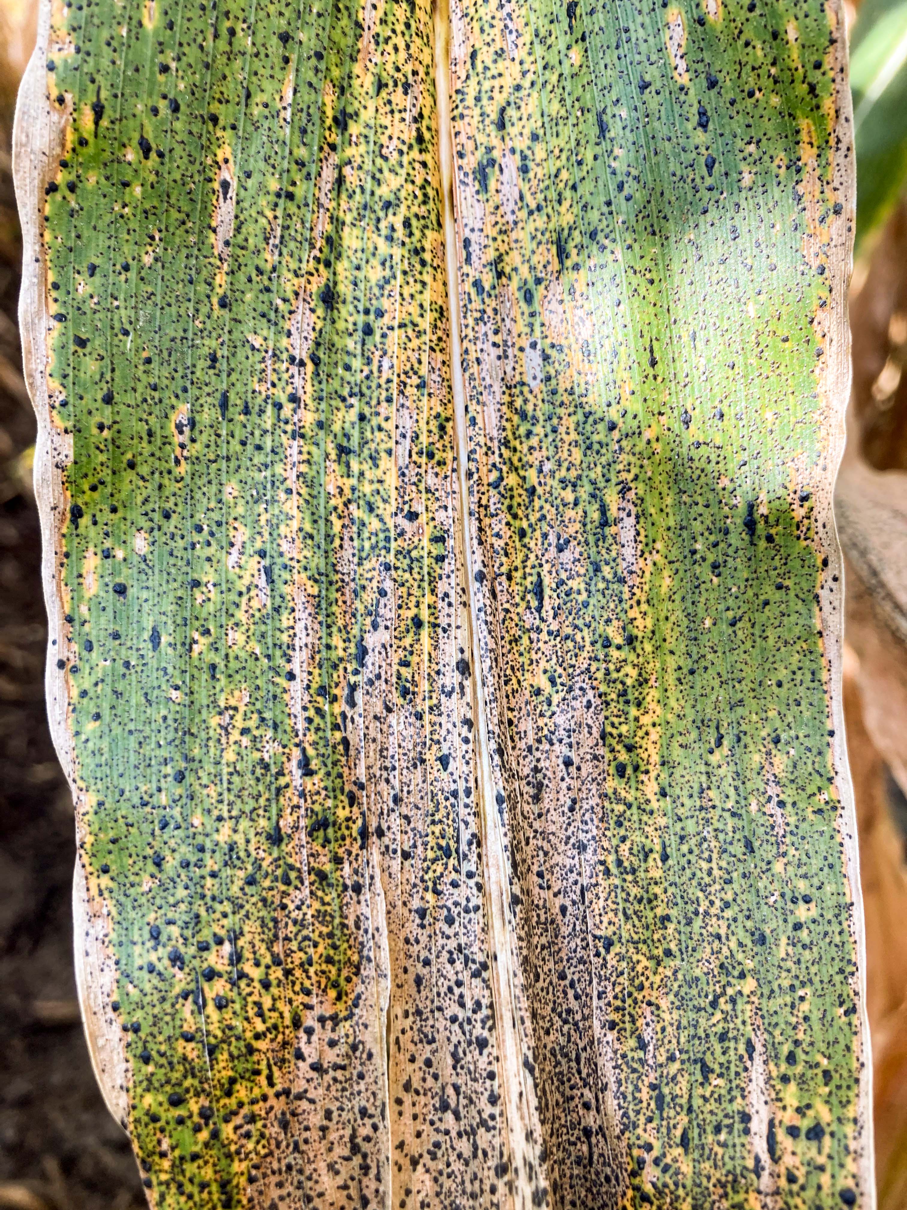 Symptôme de la tache goudronneuse sur une feuille de maïs.