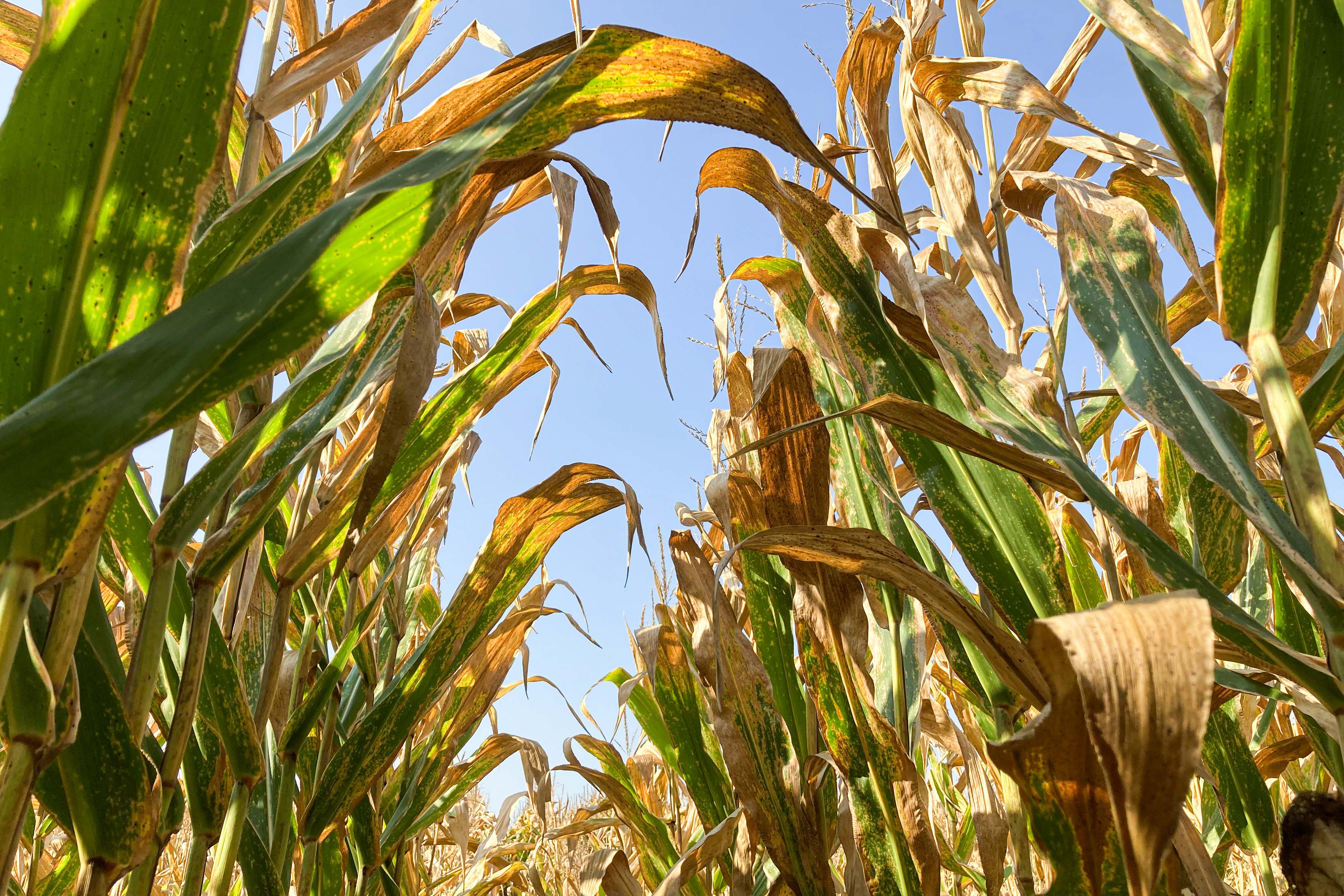 Symptôme de la tache goudronneuse sur une feuille de maïs.