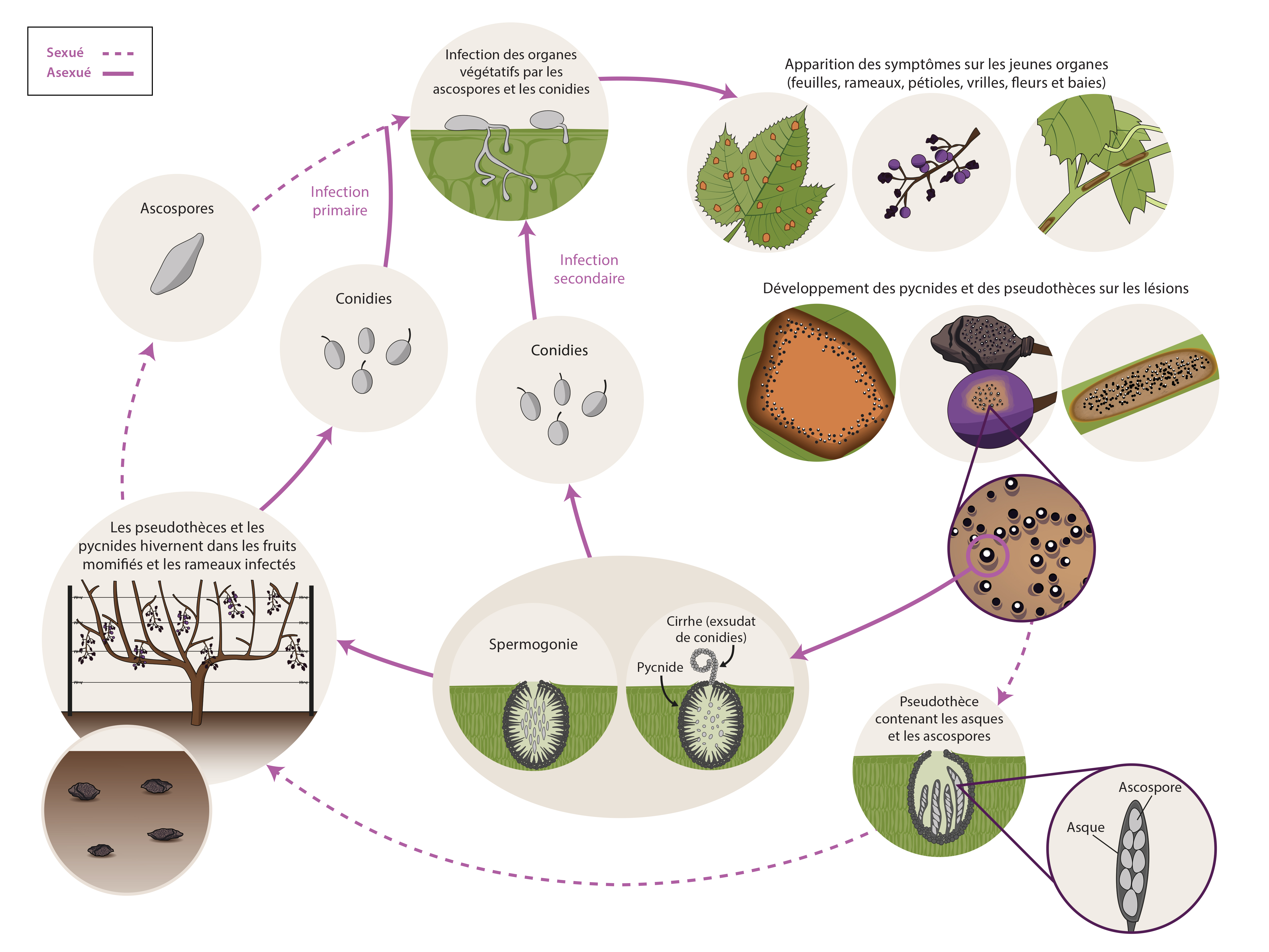 Cycle épidémiologique de la pourriture noire de la vigne causée par le champignon Phyllosticta ampelicida (syn. Guignardia bidwelli)