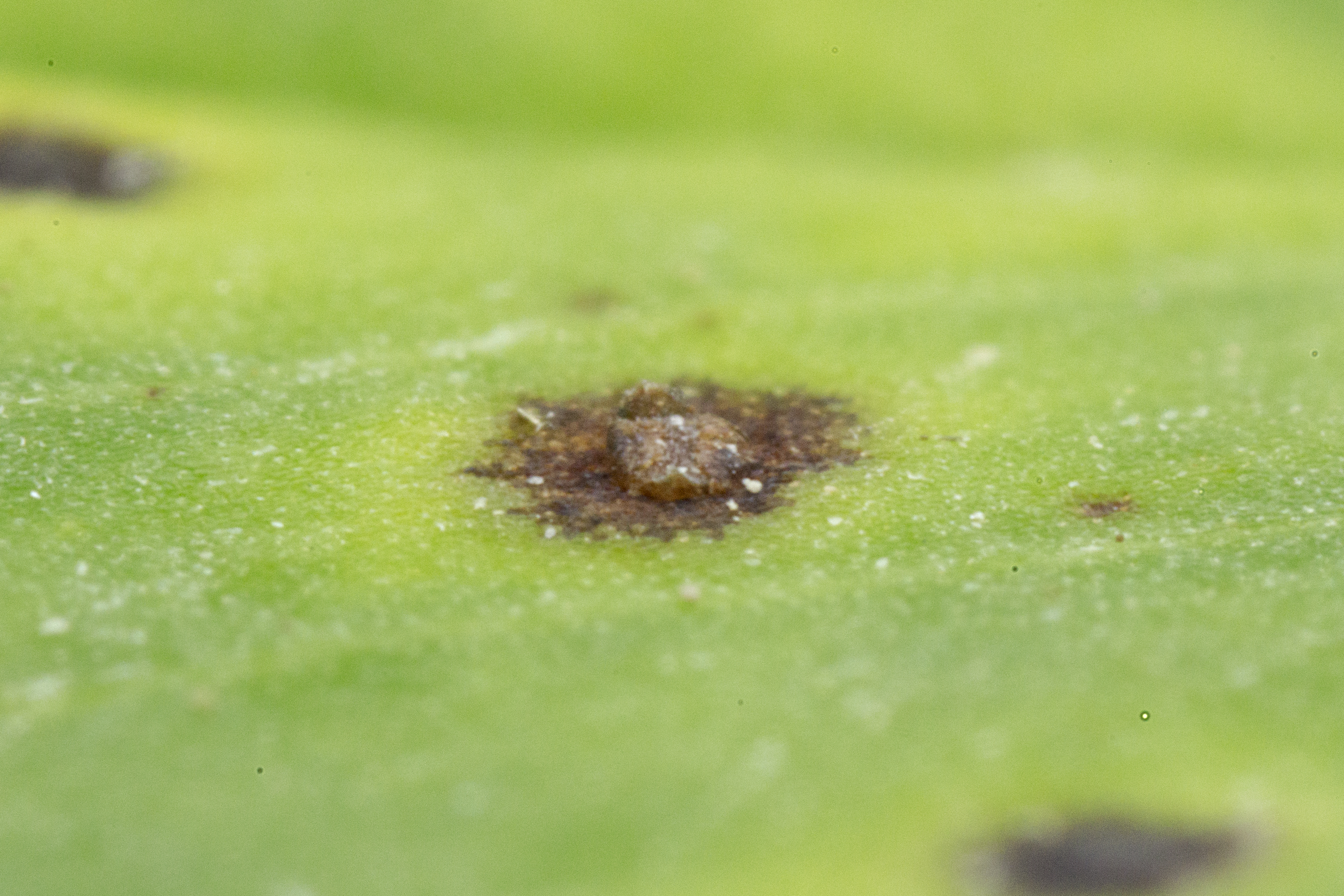 Vue rapprochée d'une apothécie de Pseudopeziza sp. sur une feuille de luzerne