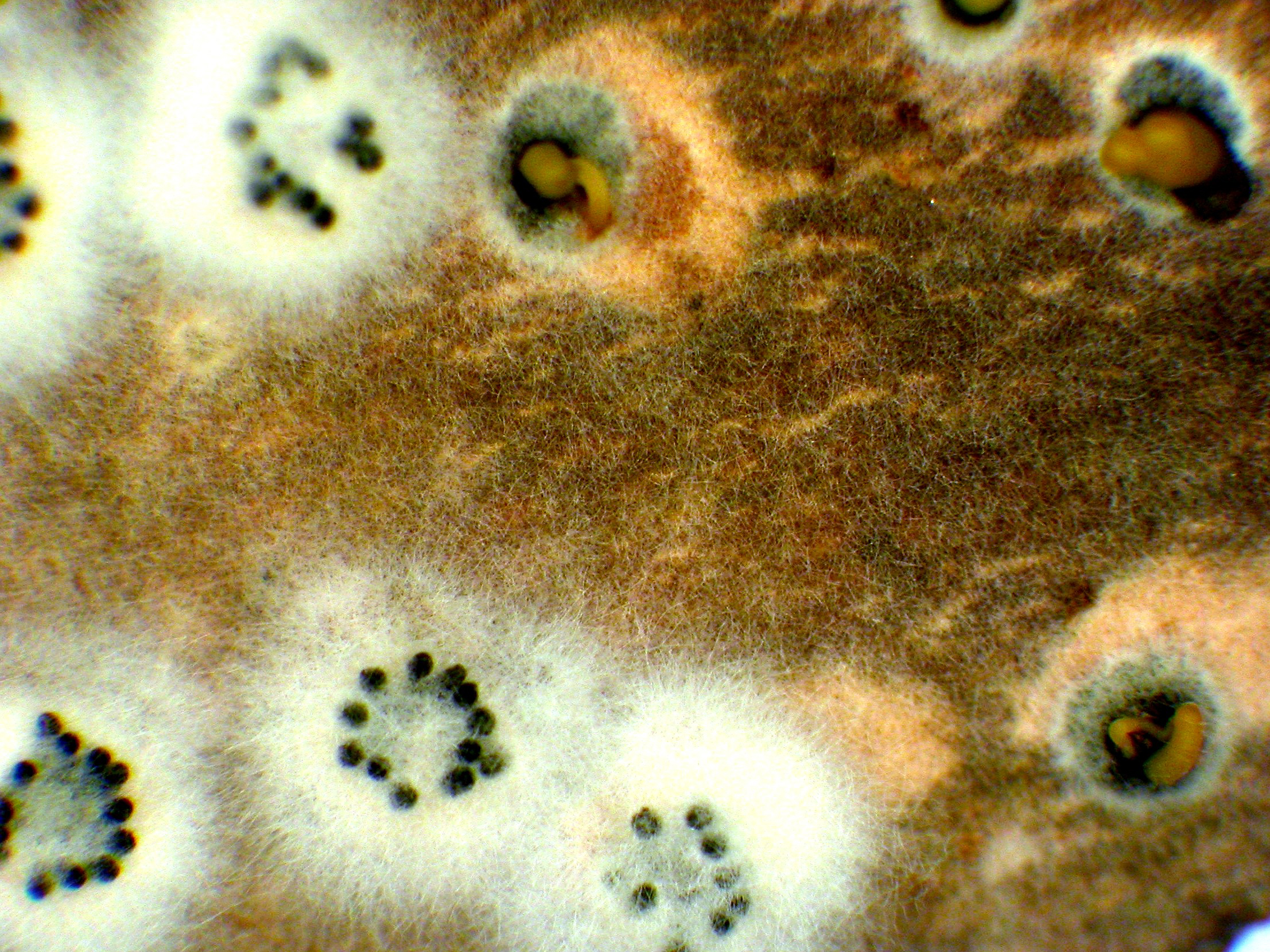 Pycnides noires de Cytospora sp. et cirrhes orangés (Stéréomicroscope)
