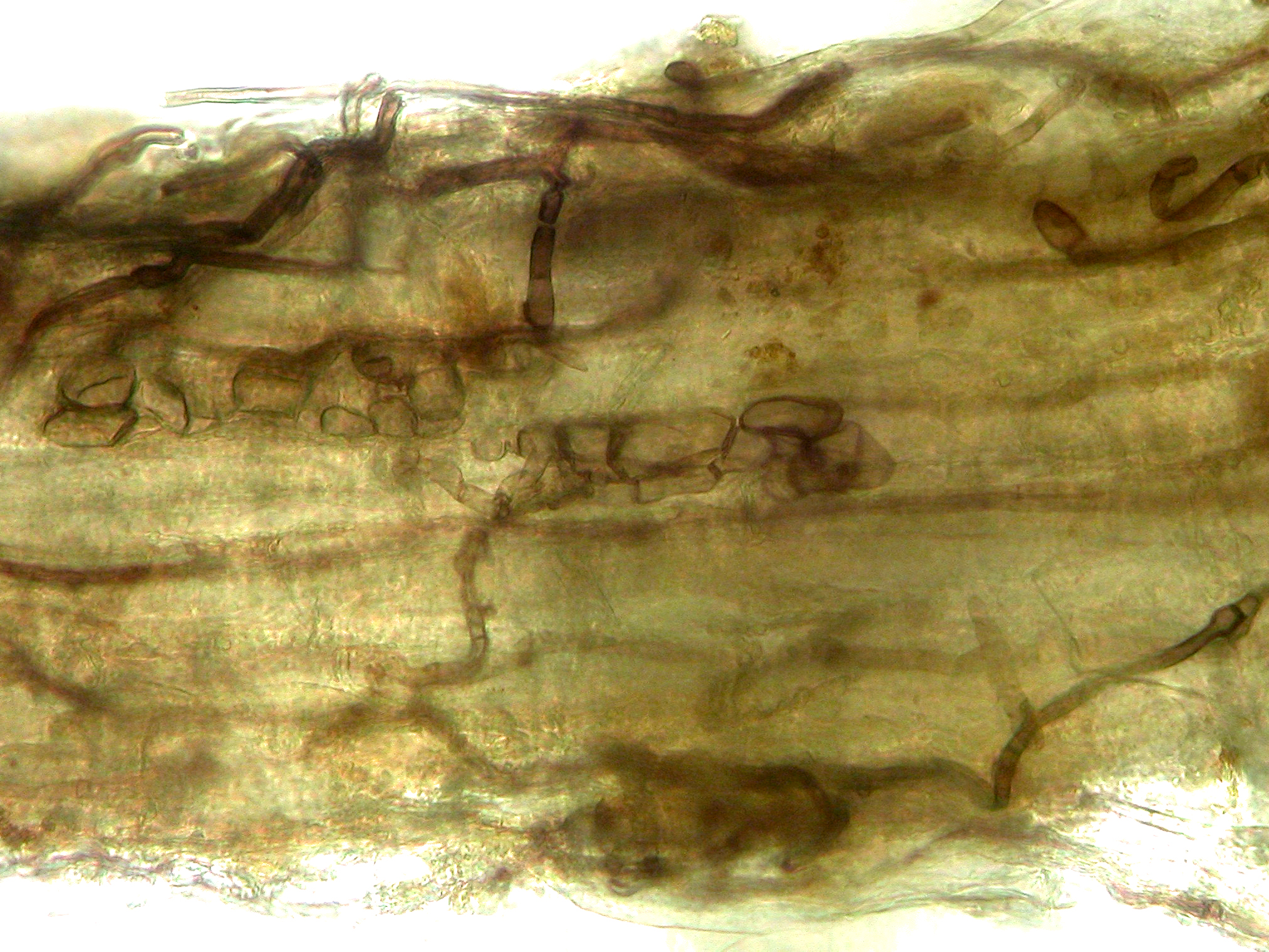 Hyphes rampants brun foncé ("Dark runner hyphae") ectotrophiques de Gaeumannomyces graminis sur les racines d'une graminée (x 100)