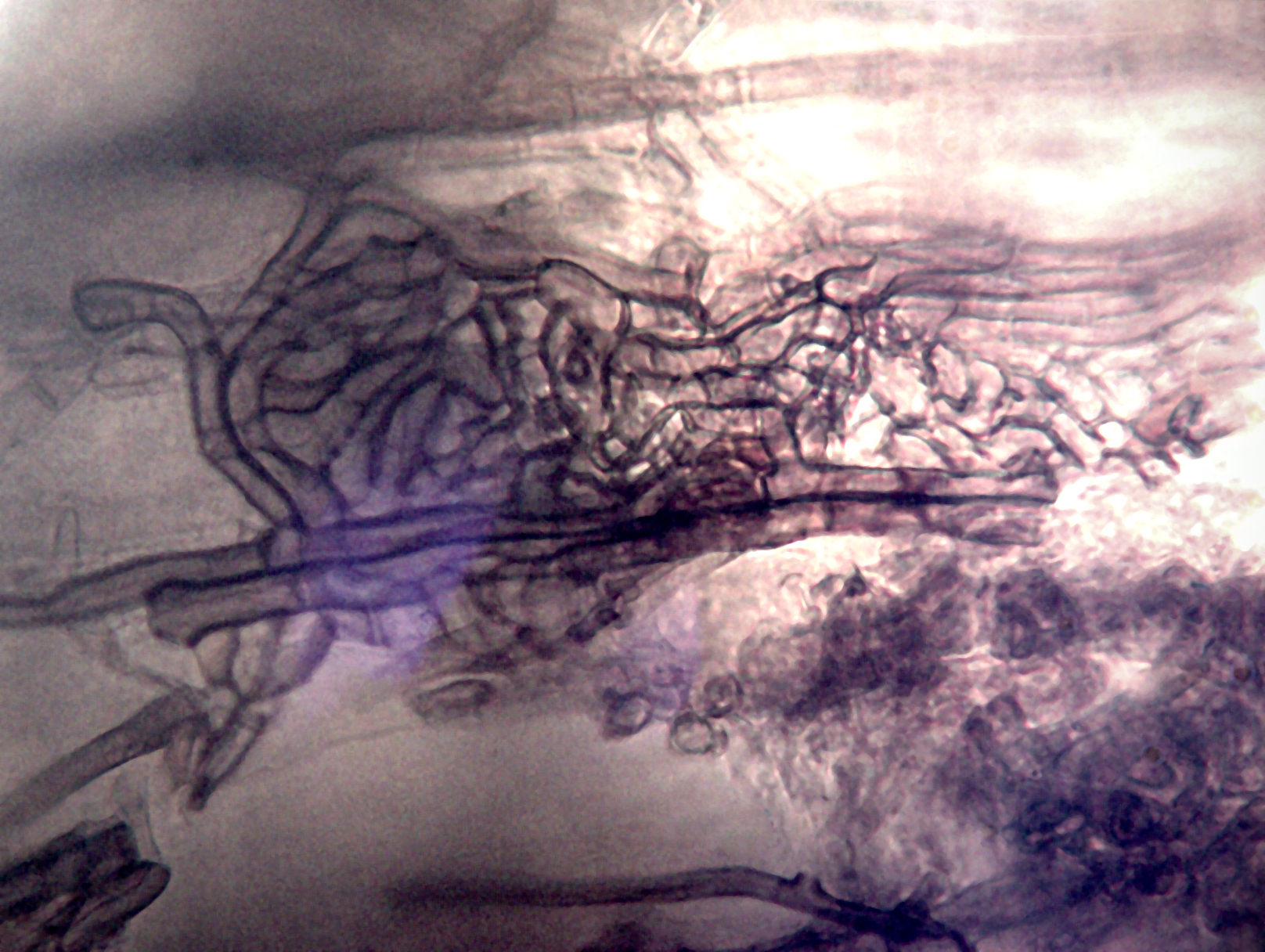 Hyphes rampants brun foncé ("Dark runner hyphae") ectotrophiques de Gaeumannomyces graminis sur les racines d'une graminée