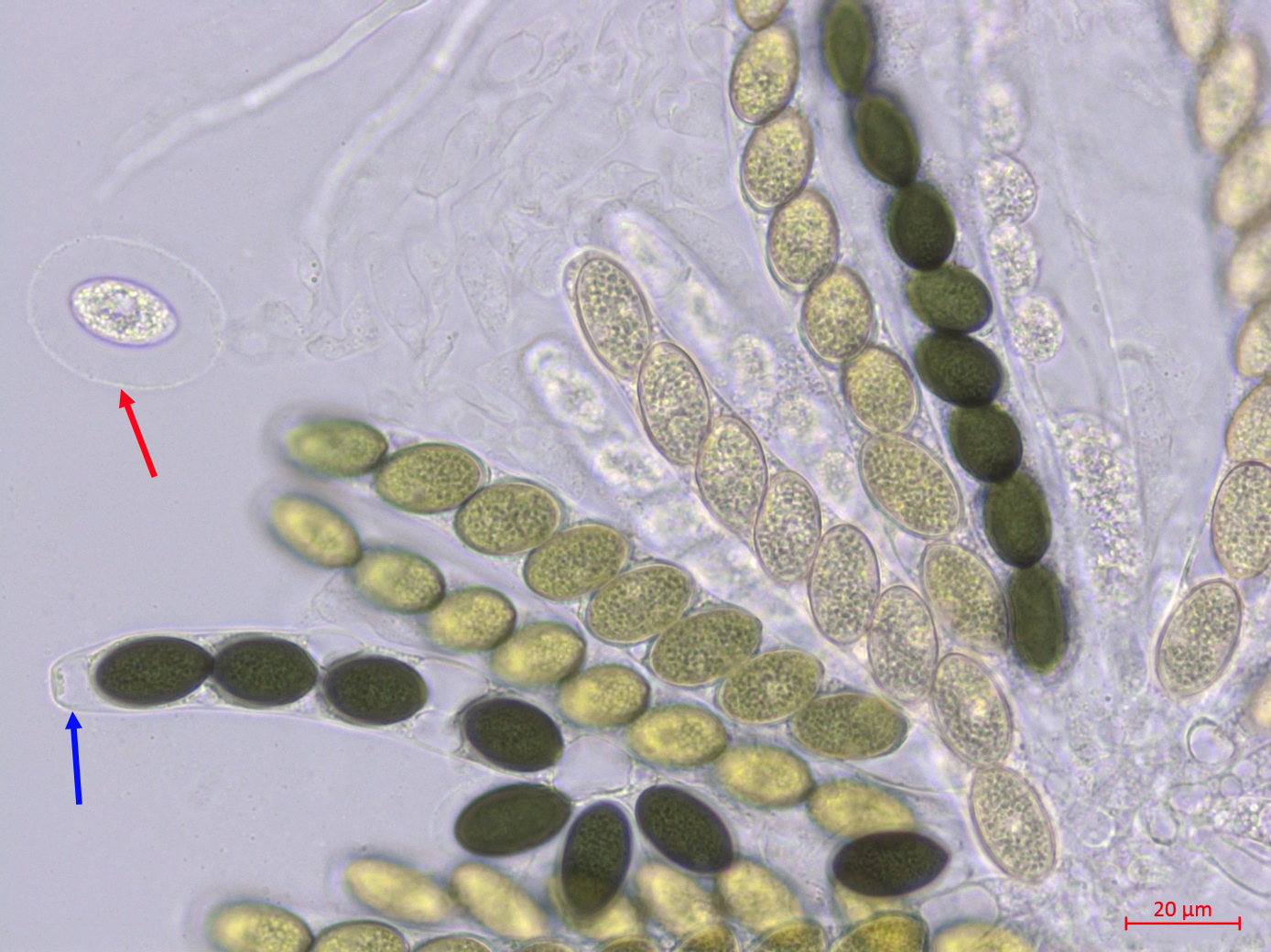 Caractéristiques visibles : Ascospore avec épaisse gaine mucilagineuse (flèche rouge) et asque avec anneau apical (flèche bleue)