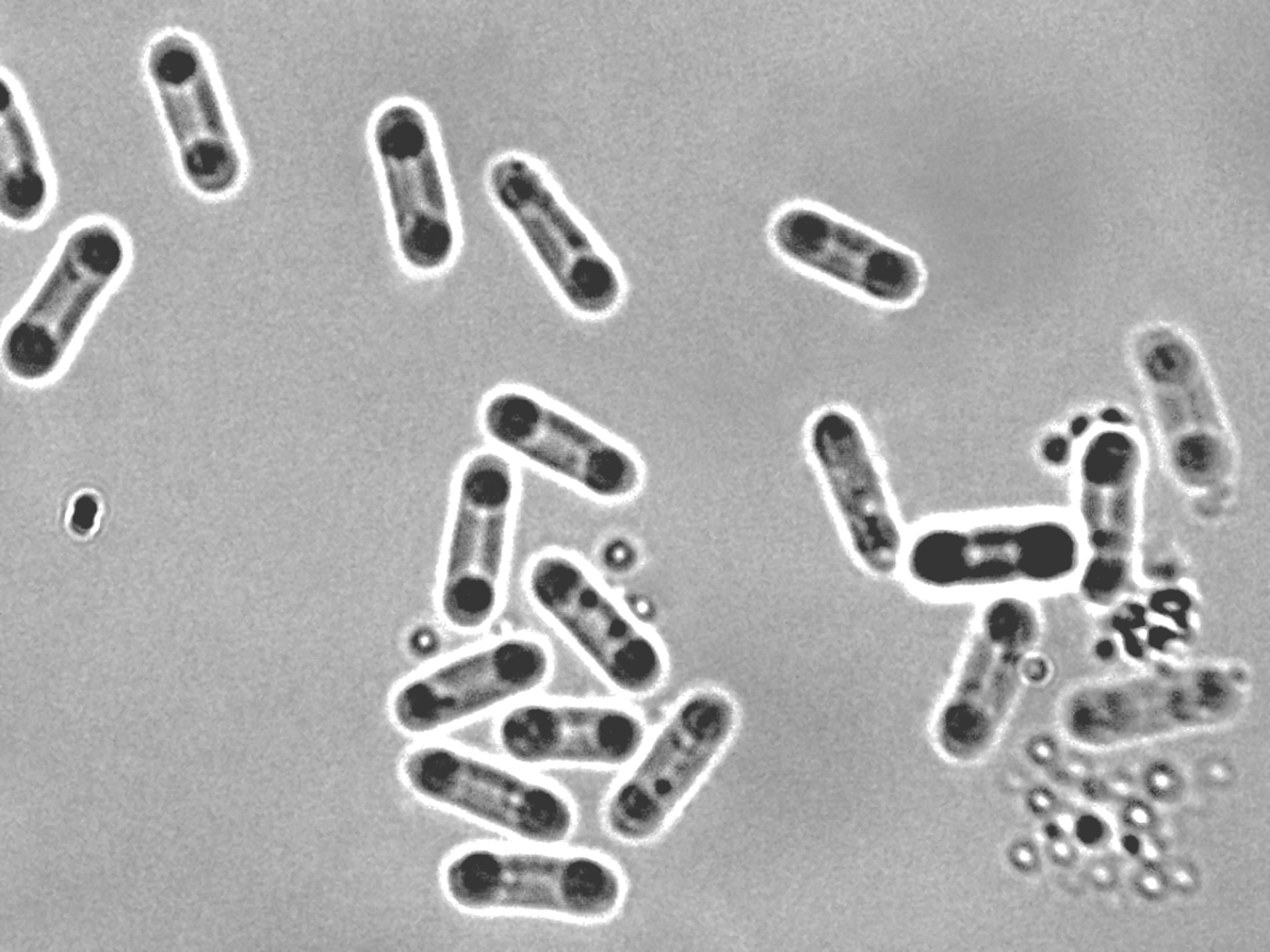 Conidies (guttulées aux deux extrémités) de Zythia sp. (les guttules réfractent la lumière) (x 200)