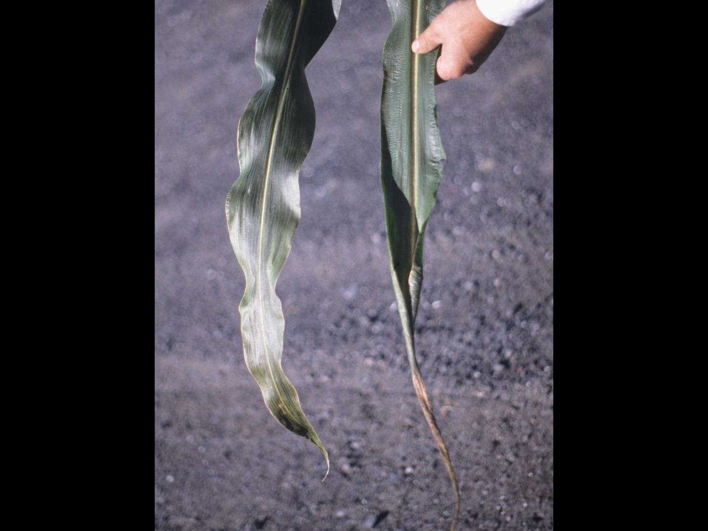 Cas BanvelMD (dicamba) – Le dicamba est un herbicide faisant partie des acides benzoïques. Il est considéré comme un régulateur de croissance et est utilisé pour lutter contre les mauvaises herbes à feuilles larges, annuelles, bisannuelles et vivaces. Le dicamba est homologué dans la culture du maïs, des céréales, des prairies et du bleuet nain. Chez le maïs, il peut être pulvérisé en prélevée ou en postlevée de la culture et le contact entre l’herbicide et la semence doit être évité. Dans ce cas, les symptômes pourraient être confondus avec ceux causés par une mauvaise utilisation de l’herbicide 2,4 D. Les herbicides régulateurs de croissance peuvent causer toute une variété d’anomalies de croissance chez les espèces sensibles, selon l’intensité de leur exposition au produit. Les symptômes de phytotoxicité se rapportant au dicamba sont des déformations (épinastie) de la tige et des pétioles, un renflement (au niveau des nœuds) et une élongation anormale de la tige, des feuilles en forme de cuillère et une stimulation de la croissance de racines secondaires. S'ensuit le jaunissement des points de croissance, le flétrissement et la nécrose des tissus. Parce que le dicamba est systémique, les symptômes qui lui sont attribuables apparaissent à la suite de la translocation du produit dans la plante, autant par le phloème que le par le xylème, et généralement chez les plus jeunes feuilles, ce qui peut prendre d’un à trois jours. Les symptômes au champ présentent un gradient allant du plus affecté au moins affecté, à mesure que l’on s'éloigne de la zone traitée. Le dicamba agit lentement: les tissus des plantes touchées peuvent demeurer verts jusqu'à trois semaines après pulvérisation de l'herbicide.