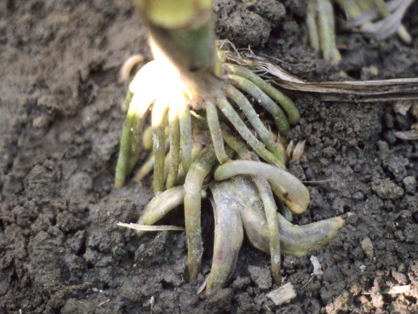Racines : déformées (racines d’ancrage courtes et fusionnées, croissance vers le haut). Stimulation de la croissance de racines secondaires.