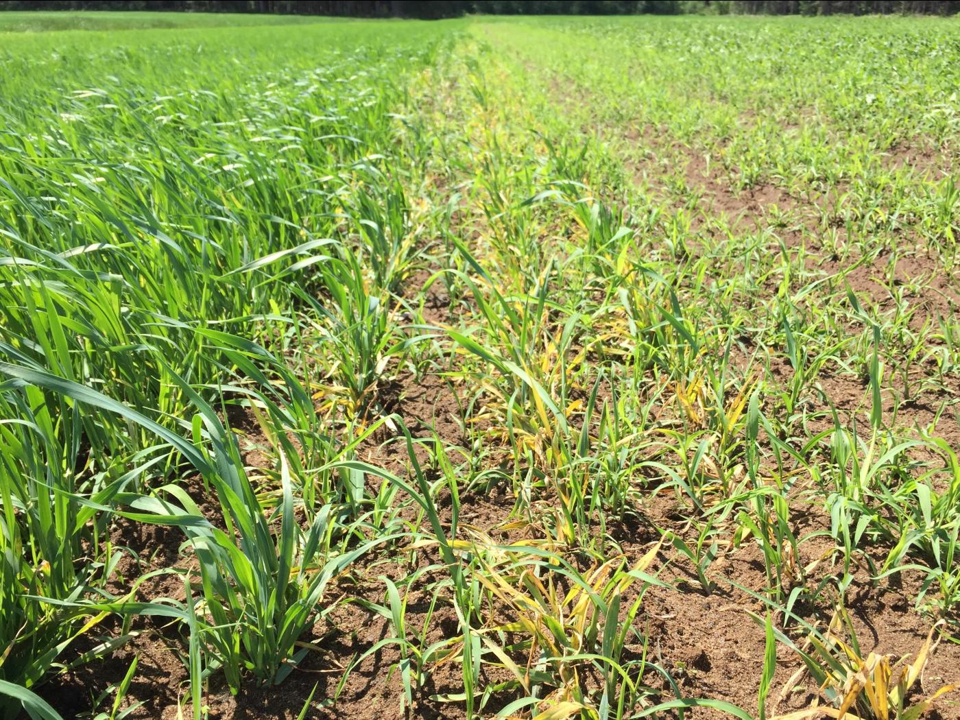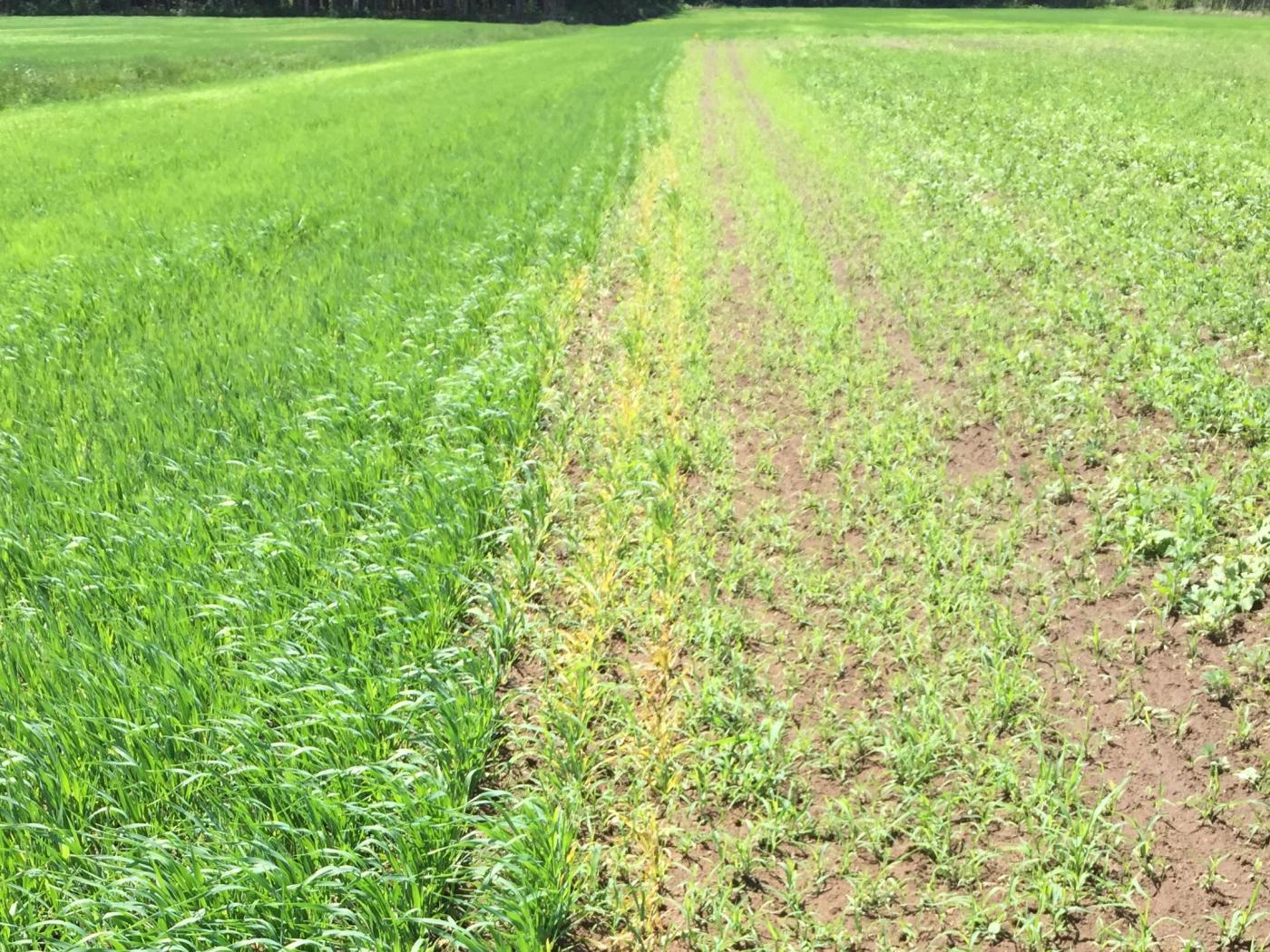 Description: Dans un champ d’orge, quelques rangs situés directement à côté d’un champ de quinoa présentent des plants dont les feuilles sont jaunies et/ou brûlées. Le champ de quinoa voisin a reçu une application de l’herbicide ASSUREmdII (avec surfactant). Les symptômes dans le champ d’orge sont apparents environ deux semaines après la pulvérisation. Ceux-ci seraient attribuables à la dérive de l’herbicide, non homologué pour la culture d’orge.