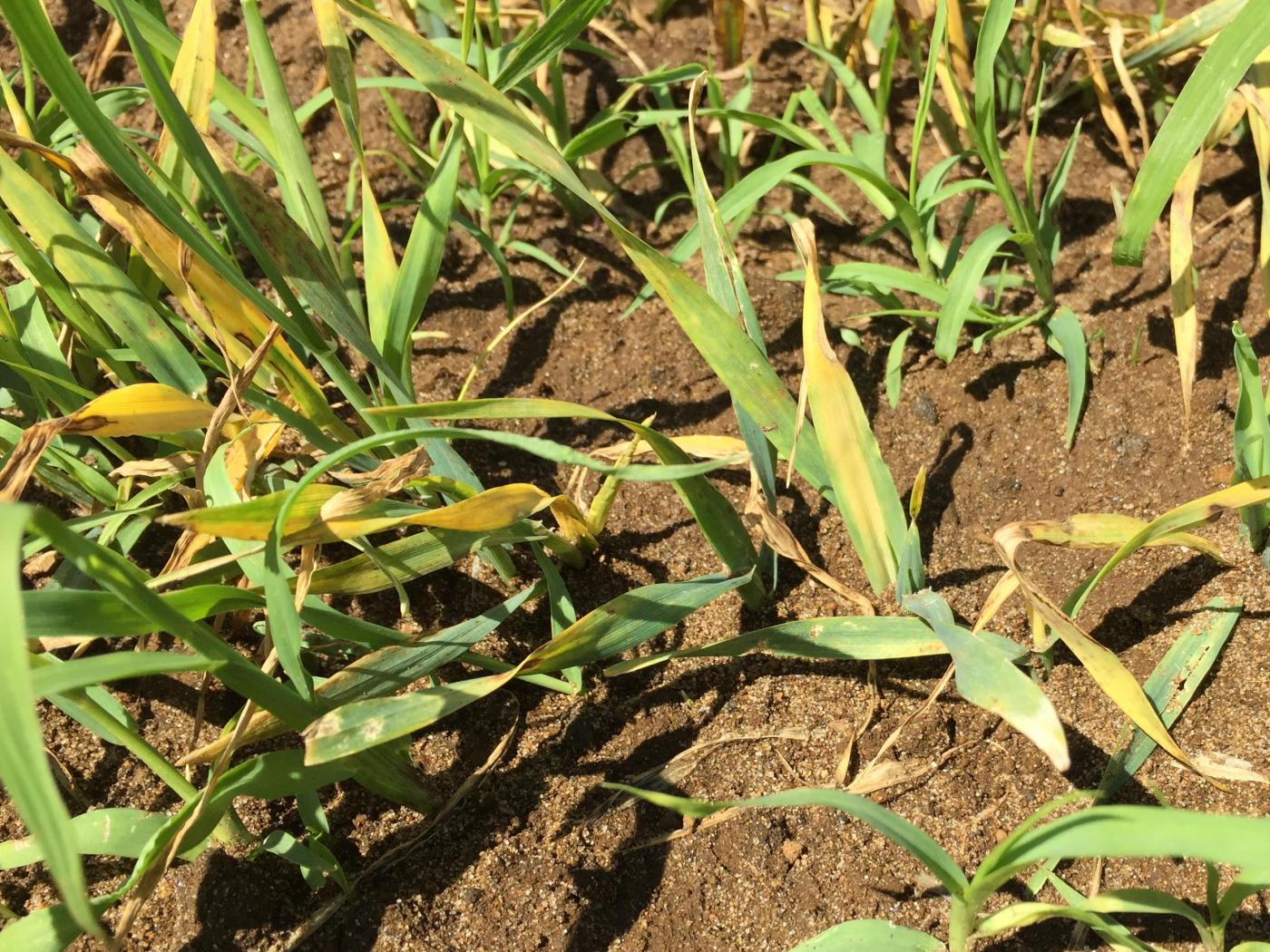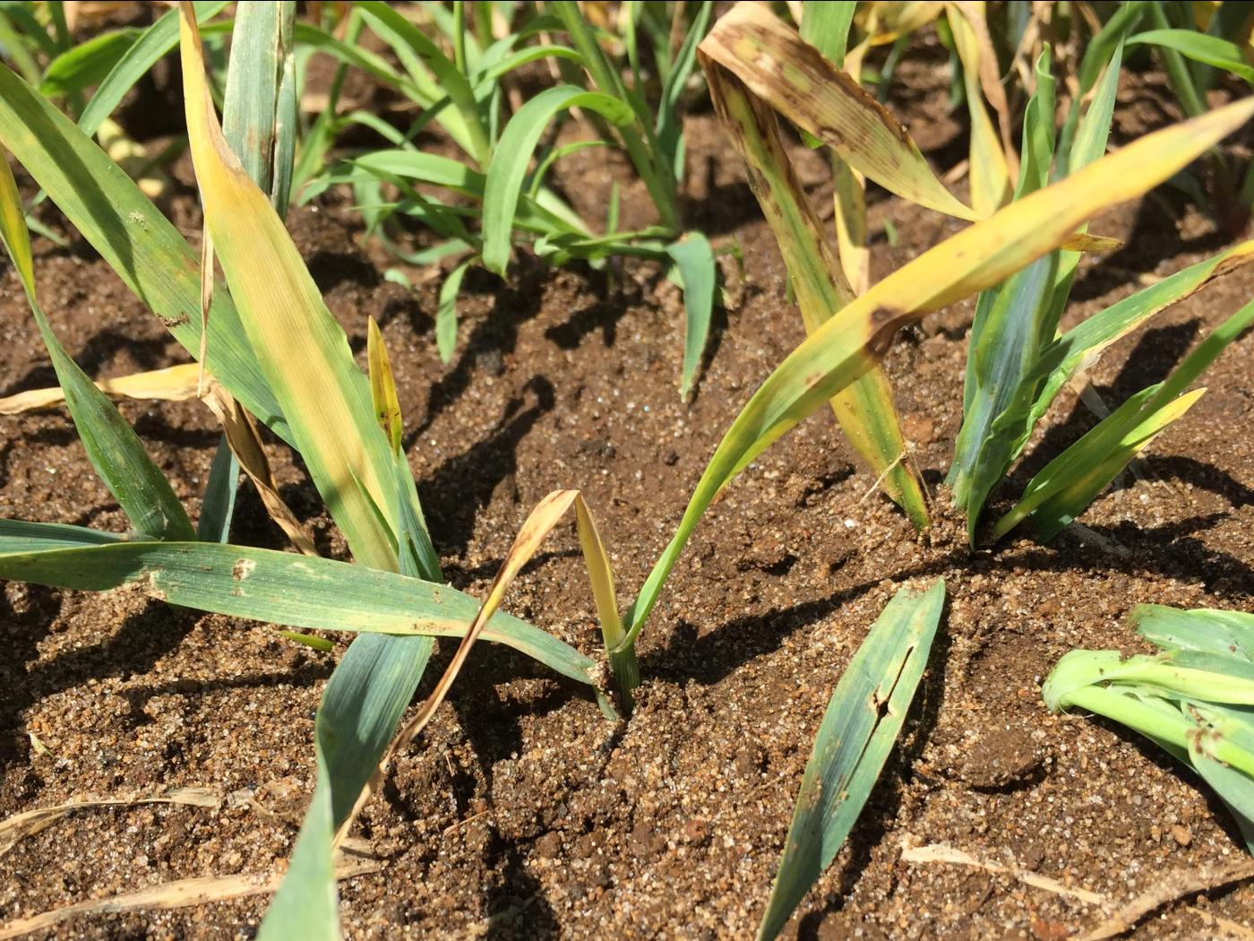 Description: Des plants d’orge ont des feuilles médianes et terminales jaunies et/ou brûlées. Le champ de quinoa voisin a reçu une application de l’herbicide ASSUREmdII (avec surfactant). Les symptômes dans le champ d’orge sont apparents environ deux semaines après la pulvérisation. Ceux-ci seraient attribuables à la dérive de l’herbicide, non homologué pour la culture d’orge.