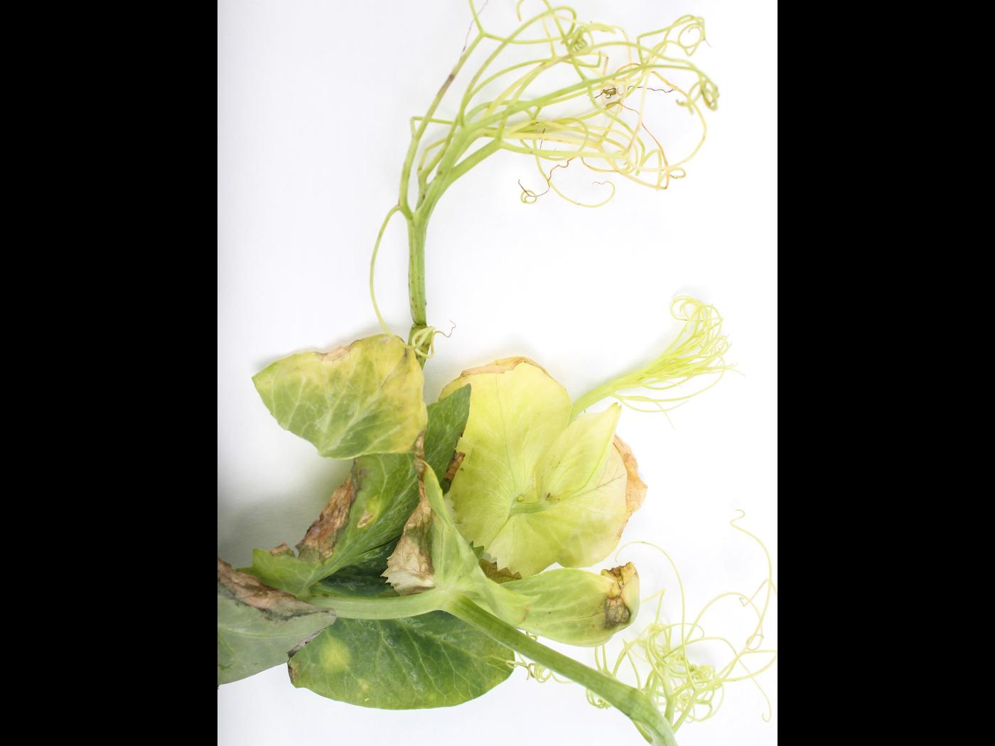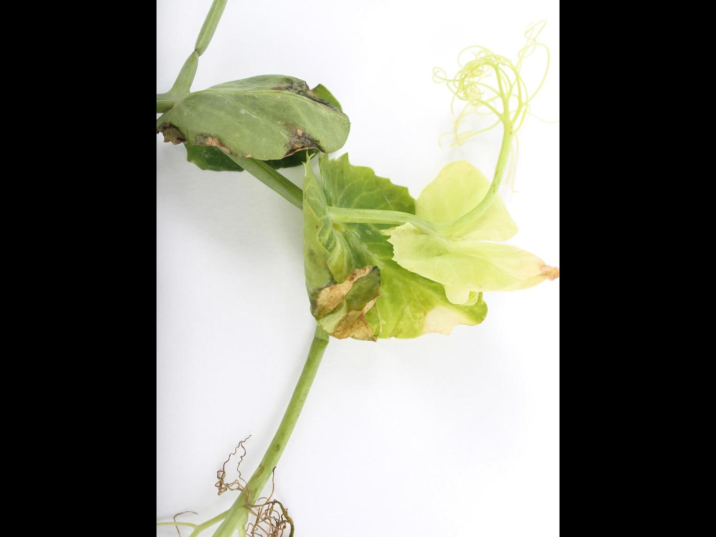 Légende: Jaunissement à blanchiment des jeunes feuilles de pois