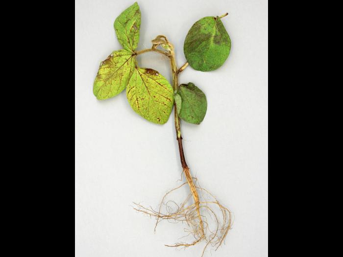 Description: Sur un plant de soya (cv 'Colt'), les nervures des feuilles sont brunes à violettes et le limbe est jauni. Le plant a une faible croissance pour la période de l'année (juillet) et ne dépasse pas 15 cm de hauteur. Le nanisme, des chloroses sur les feuilles et des malformations du système racinaire sont des symptômes ou dommages provoqués par l’herbicide GUARDIAN. Les symptômes observés sur le plant de soya sont caractéristiques d’une phytotoxicité à un des deux herbicides du GUARDIAN PLUS WD, le … En savoir plus