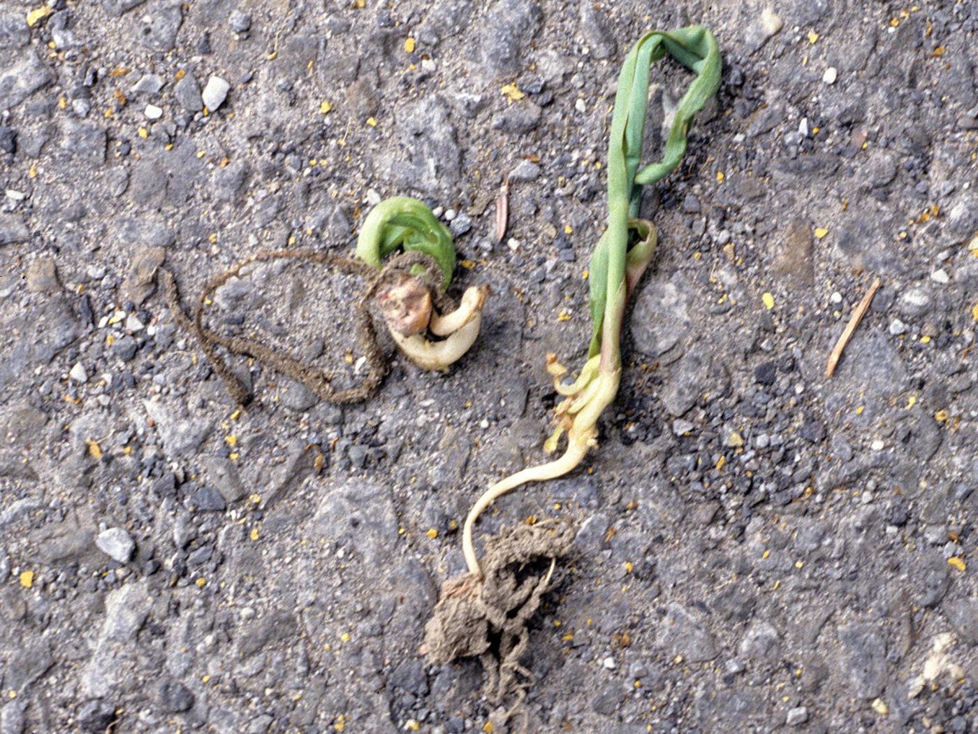 Description: Les plantules de maïs grain et fourrager sont déformées et leur croissance est inhibée. Les feuilles sont enroulées sur elles-mêmes et le système racinaire est peu développé et parfois pourri (peu visible sur cette photo). Le semis trop superficiel a exposé les semences à l’herbicide dicamba.