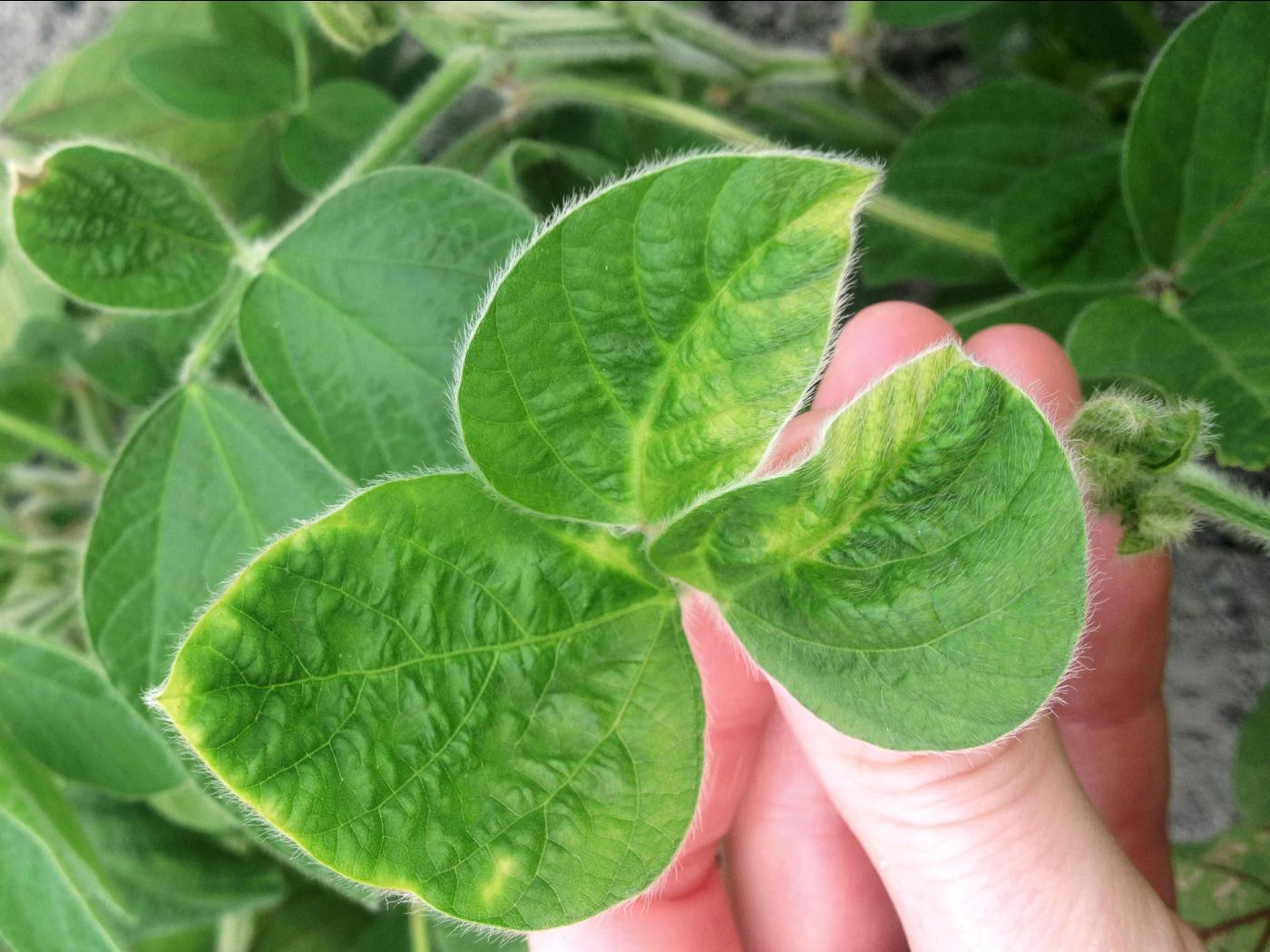 Feuille : chez les dicotylédones telles le soya, les feuilles sont crispées et la nervure centrale est courte, ce qui donne à la feuille la forme d'un coeur et un aspect froissé («crinkled»).