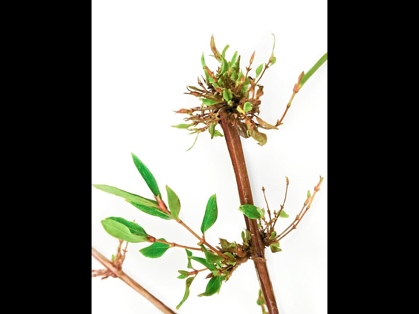 Tige : arrêt de croissance de la tige ou développement anormal de bourgeons latéraux à la base des plants, donnant une apparence de «balai de sorcière» (ou « witch’s broom ») au plant.