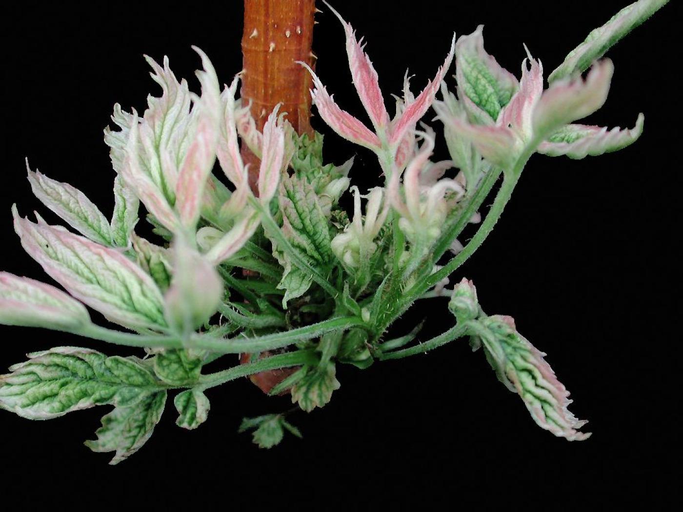 Feuille : les jeunes feuilles et les points de croissance présentent des anomalies de coloration (jaune, rose ou blanc) et des malformations (feuilles regroupées serrées en rosette, limbe réduit, feuille effilée ou petite). Les nervures demeurent vertes.