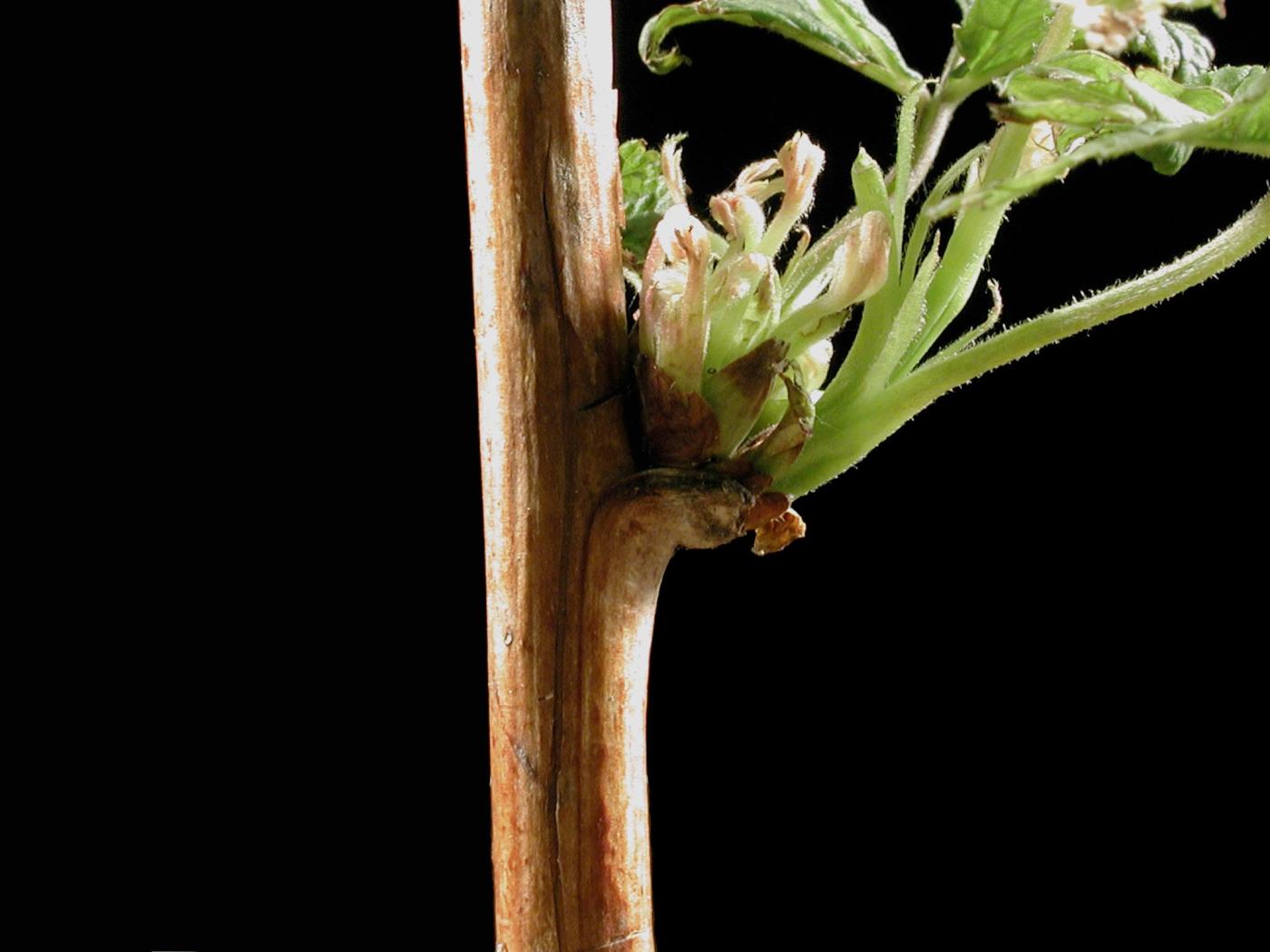 Tige : dépérissement des nouvelles pousses et des tiges. Sous les pousses détruites, développement anormal de bourgeons latéraux donnant une apparence de « balai de sorcière » au plant.