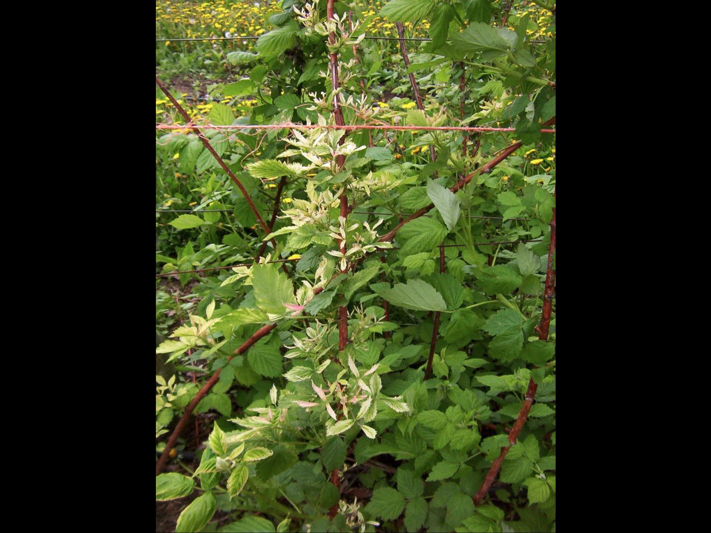 Description: Au champ, une partie des framboisiers de la première rangée sont moins développés que ceux situés juste derrière. Sur ces plants, d'importantes malformations du feuillage sont observées. Elles se caractérisent par le développement de bouquets foliaires denses et compacts (feuilles regroupées en rosette) et par une réduction importante du limbe. Ces malformations sont accompagnées d'une anomalie de coloration blanche accentuée de rose. La croissance des tiges annuelles est avortée. Les symptômes … En savoir plus