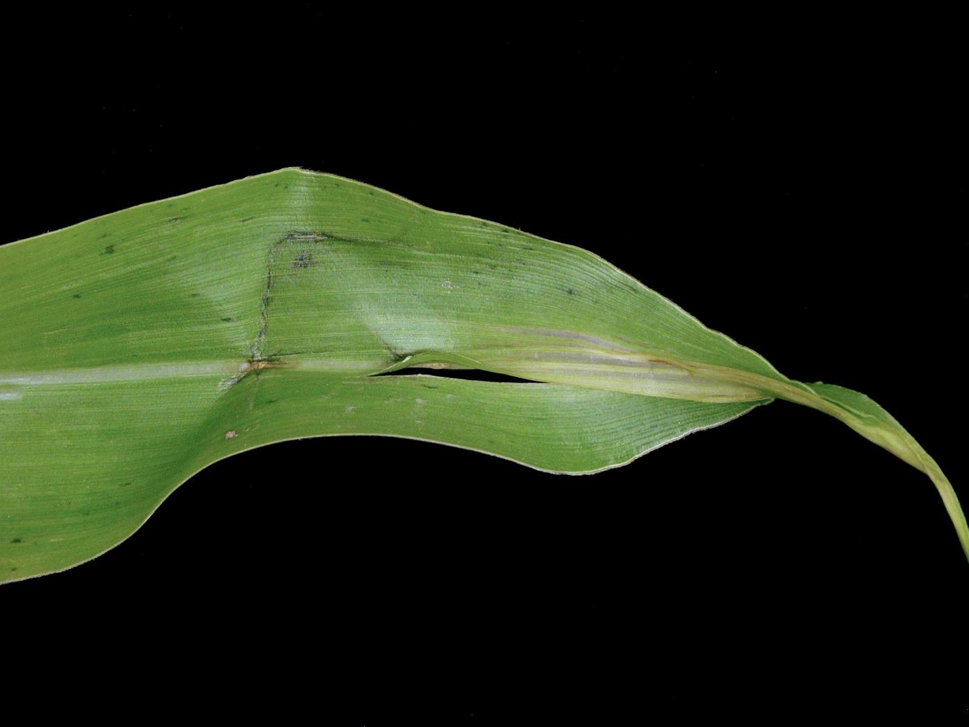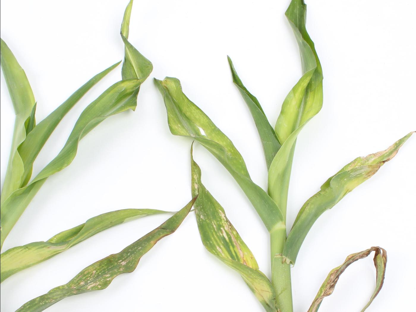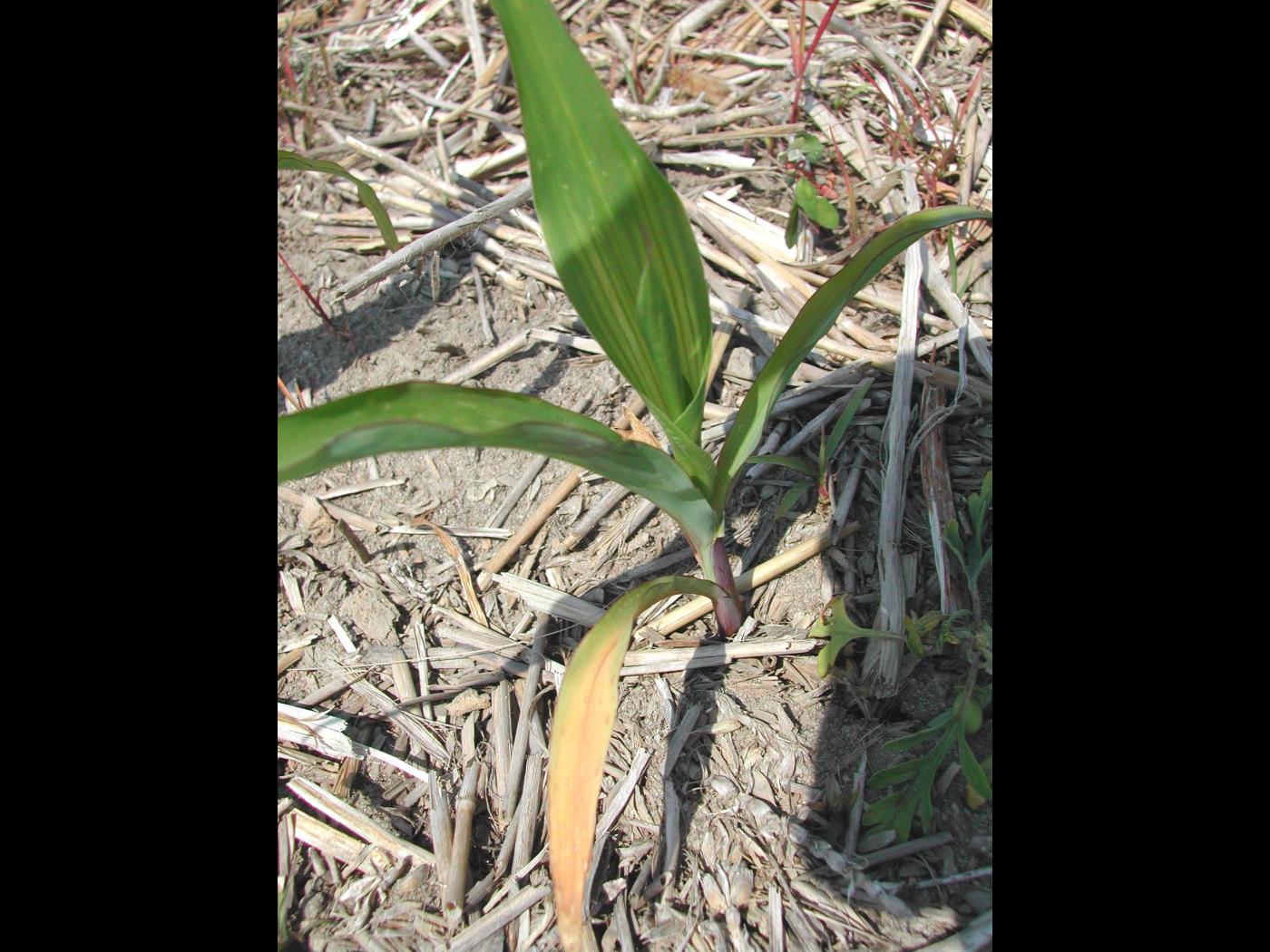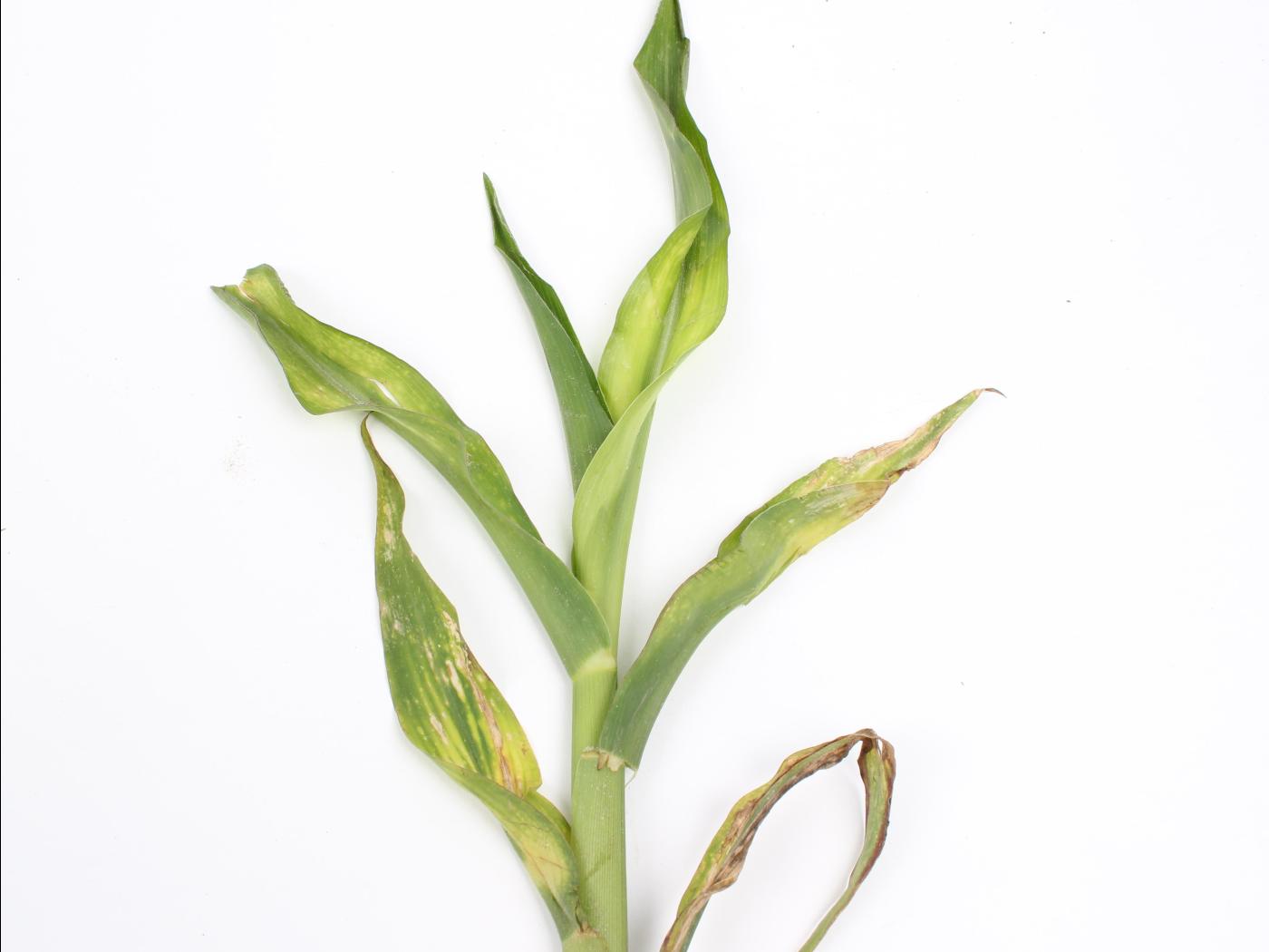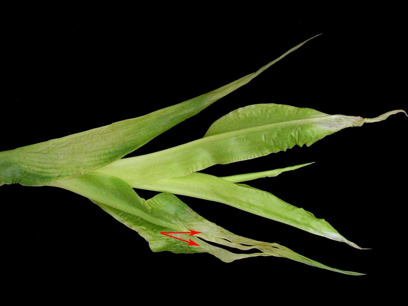 Feuille : les jeunes feuilles et les points de croissance présentent des anomalies de coloration (jaune ou blanc) et des malformations (feuilles regroupées serrées en rosette, limbe réduit, feuille effilée ou petite). Les nervures demeurent vertes. Chez le maïs, la présence de bandes blanches (« banding pattern ») sur le limbe est caractéristique d’un phytotoxicité par le glyphosate.