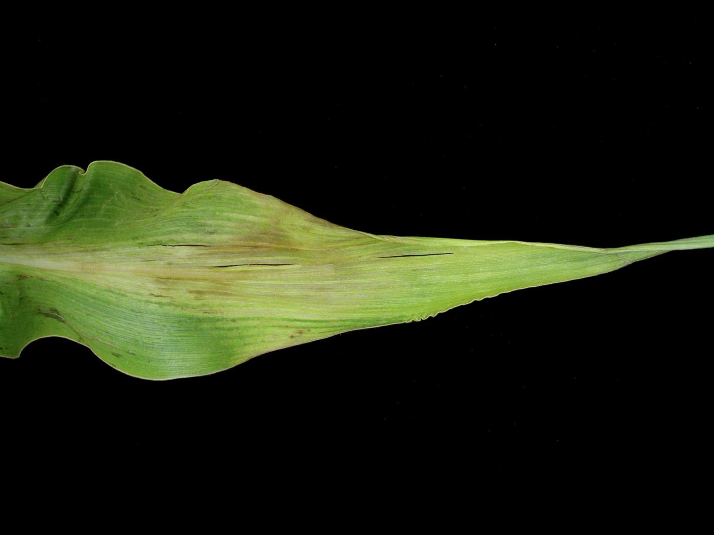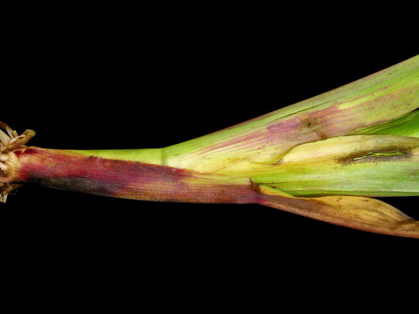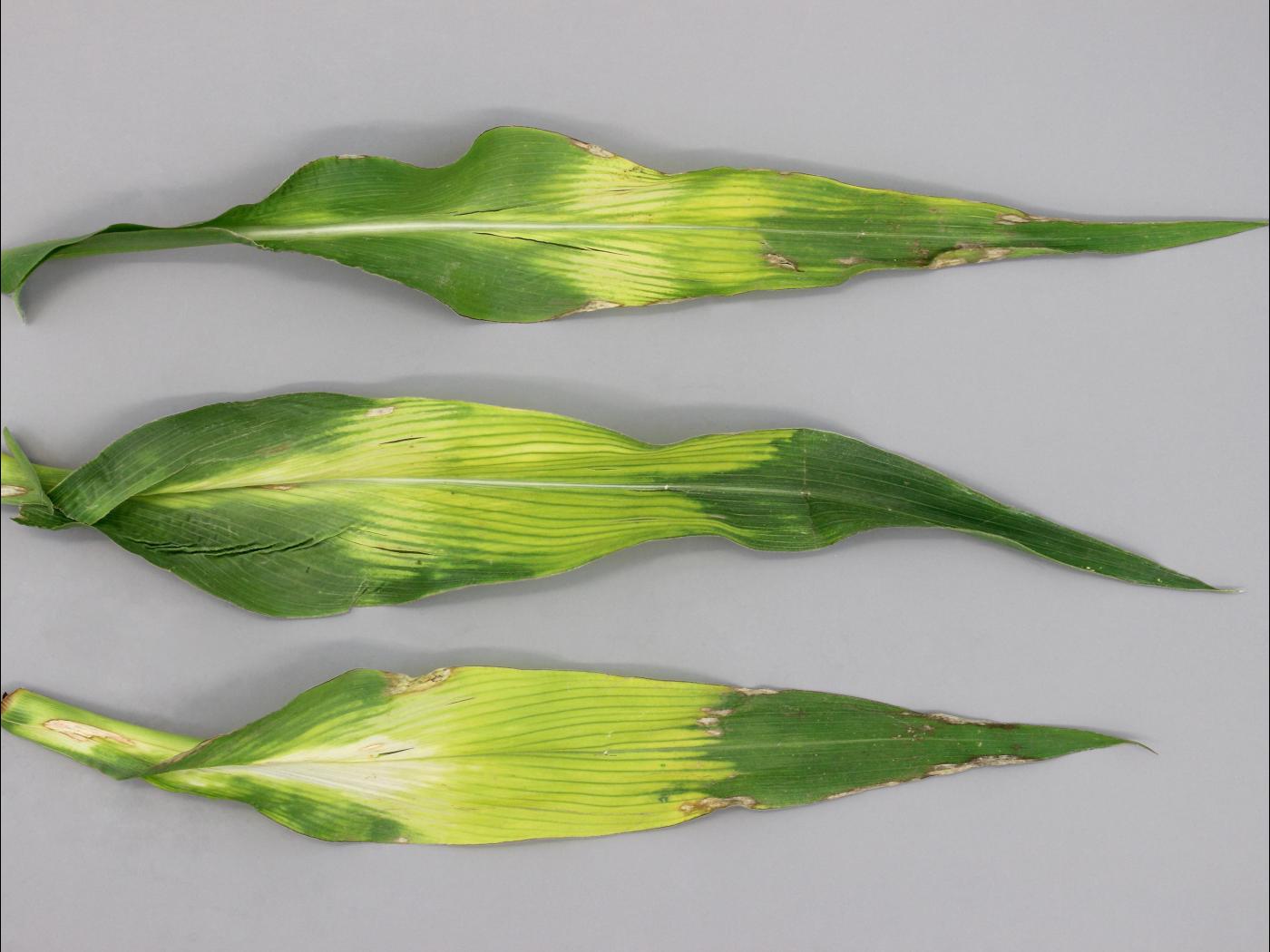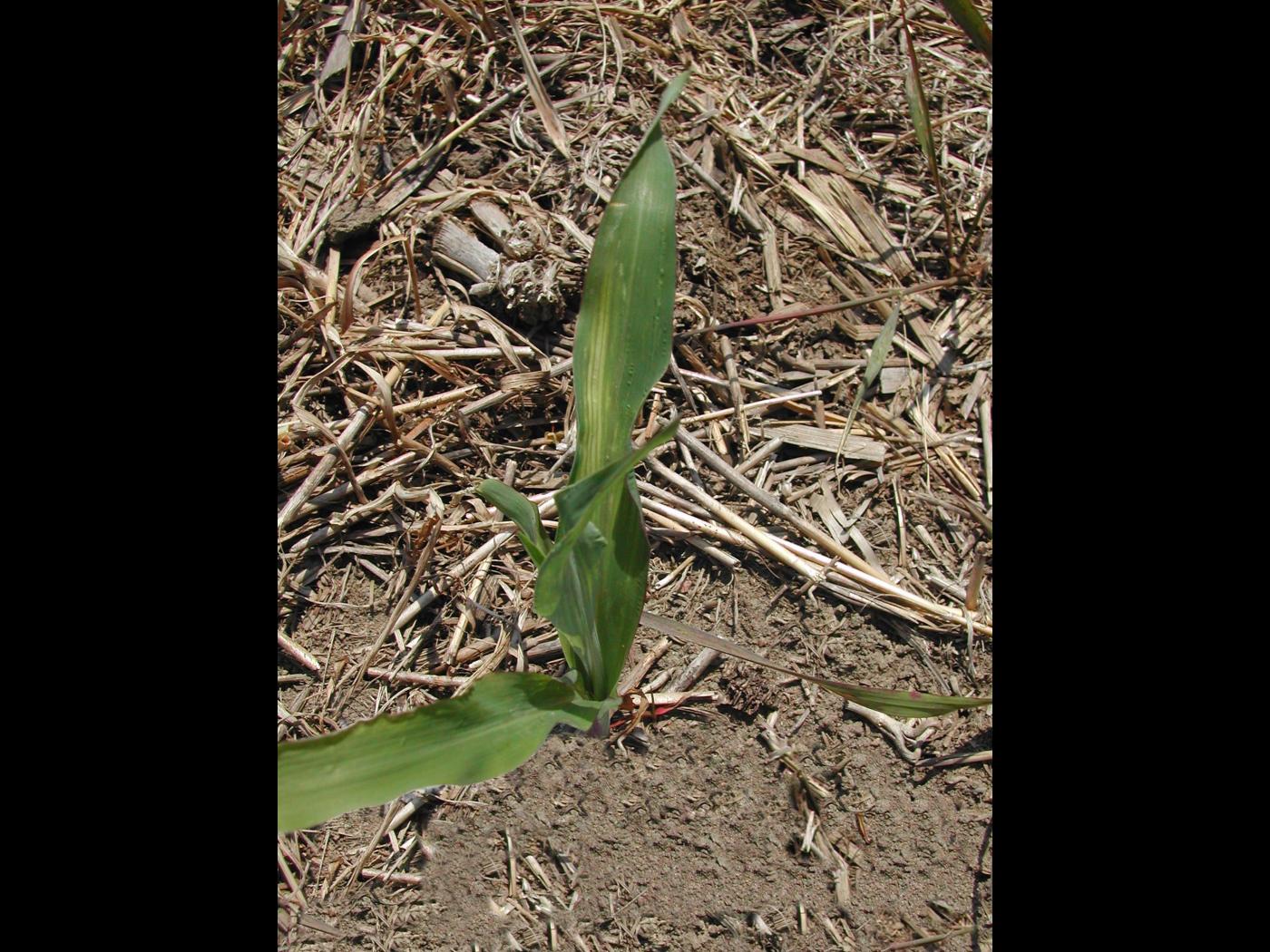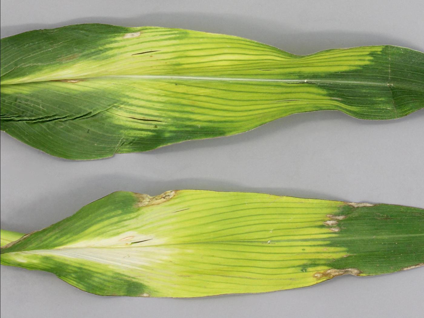 Feuille : les jeunes feuilles et les points de croissance présentent des anomalies de coloration (jaune ou blanc) et des malformations (feuilles regroupées serrées en rosette, limbe réduit, feuille effilée ou petite). Les nervures demeurent vertes. Chez le maïs, la présence de bandes blanches (« banding pattern ») sur le limbe est caractéristique d’un phytotoxicité par le glyphosate.