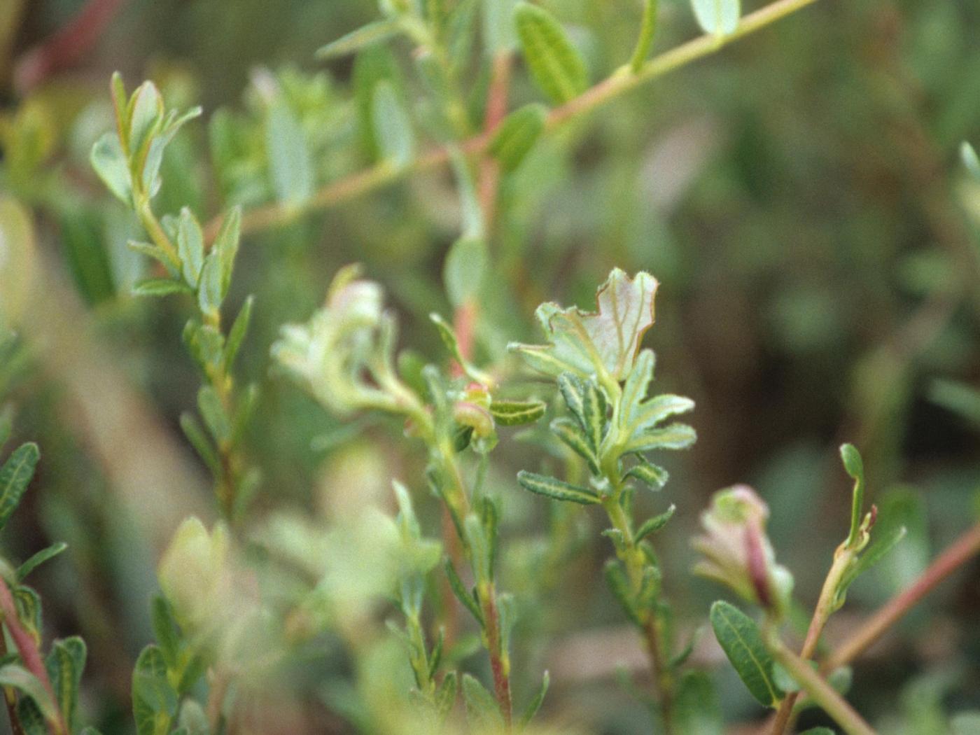 Description: Les jeunes feuilles de canneberge sont jaunies et déformées. Le limbe est réduit, gaufré et la marge est enroulée vers le bas. Les boutons floraux fermés (crochets) sont également affectés et roses. Les symptômes sont apparus à la suite d’un traitement au clopyralide (Lontrel 360) fait pour détruire la vesce jargeau et le trèfle. Lors du traitement, il y a eu contact entre l’herbicide et les feuilles de canneberges.