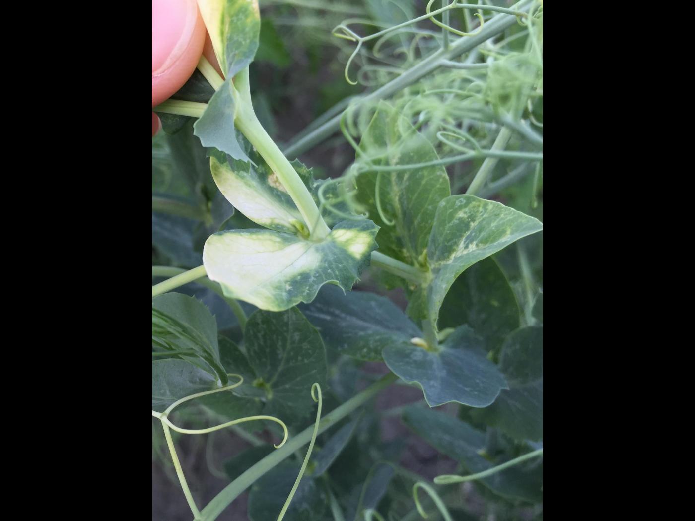 Légende: Jaunissement à blanchiment des feuilles terminales et vrilles du pois