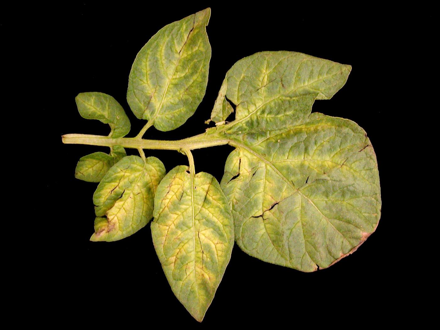 Description: Une feuille basale de pomme de terre (cv 'Envol') montre des folioles avec des nervures jaunes. Les feuilles les plus affectées étaient complètement jaunes avec une brûlure de la marge qui débutait par l’apex. Les jeunes feuilles étaient saines. Les dommages sont caractéristiques d’une phytotoxicité à la métribuzine (SENCOR) et le cultivar 'Envol' serait particulièrement sensible.   La conseillère agricole mentionne que plus de 75 % des plants sont affectés et qu’une application foliaire de la m… En savoir plus