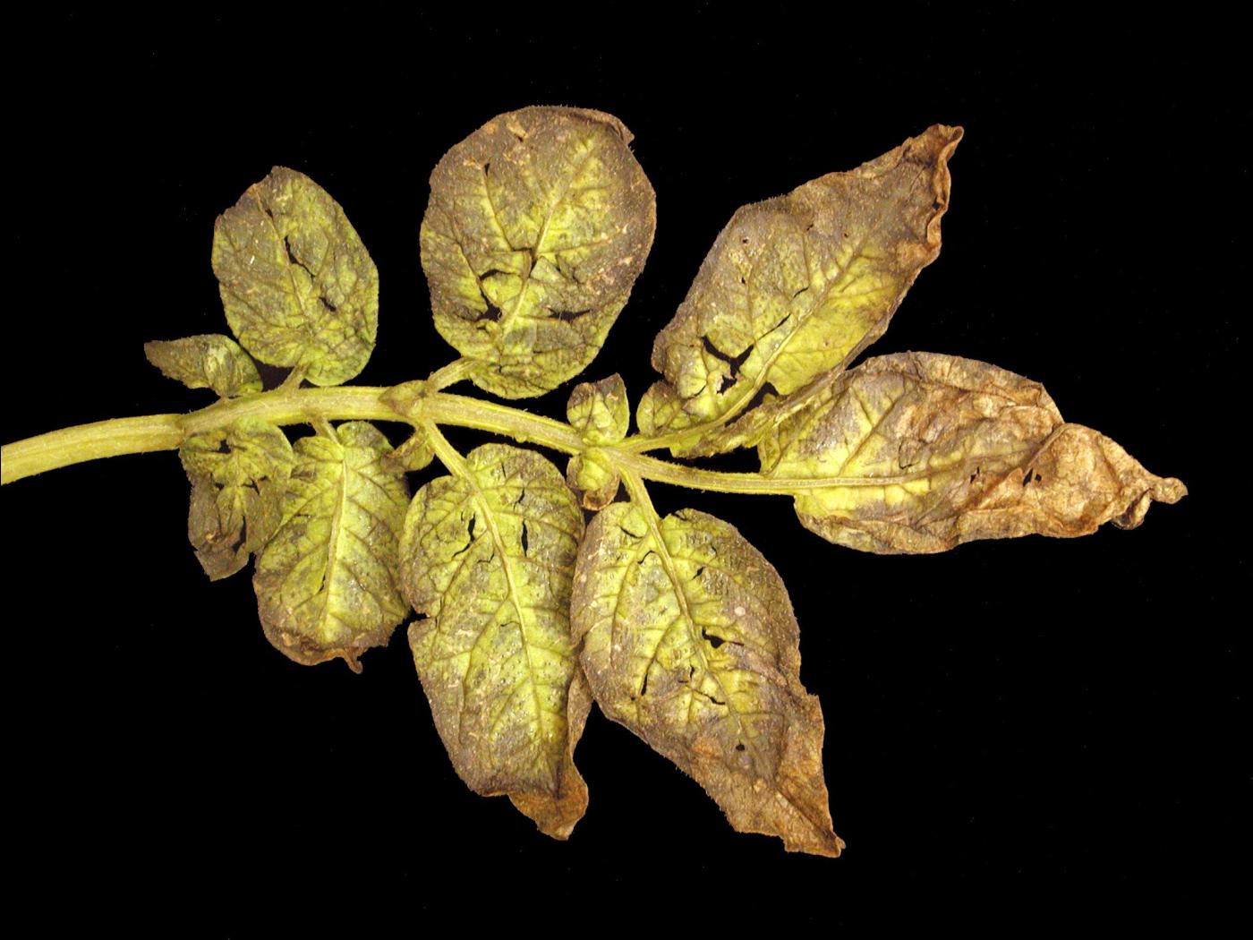 Légende: Jaunissement et brûlure sur feuille de pomme de terre