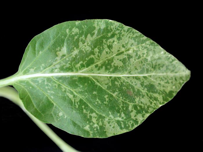 Description: Une feuille de poivron de champ montre une marbrure irrégulière blanchâtre s’apparentant à une mosaïque. Les tests de laboratoire se sont avérés négatifs pour la détection de virus. Les dommages sont la résultante d’une phytotoxicité par le régulateur de croissance CYCOCEL (chlorure de chlorméquat). Un résidu de CYCOCEL, dans un pulvérisateur mal rincé, est responsable des dommages. Les nouvelles feuilles formées après le traitement sont sans symptôme (non visible ici).