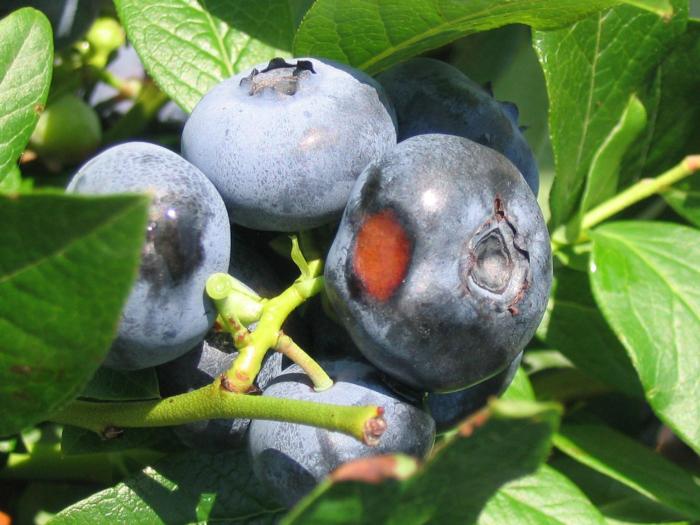 Lorsque les bleuets en corymbe sur une même grappe sont trop nombreux et d’un bon calibre, les bleuets exercent une pression l’un sur l’autre et causent des blessures franches à l’épiderme. Ce problème non parasitaire est occasionnel et mineur.