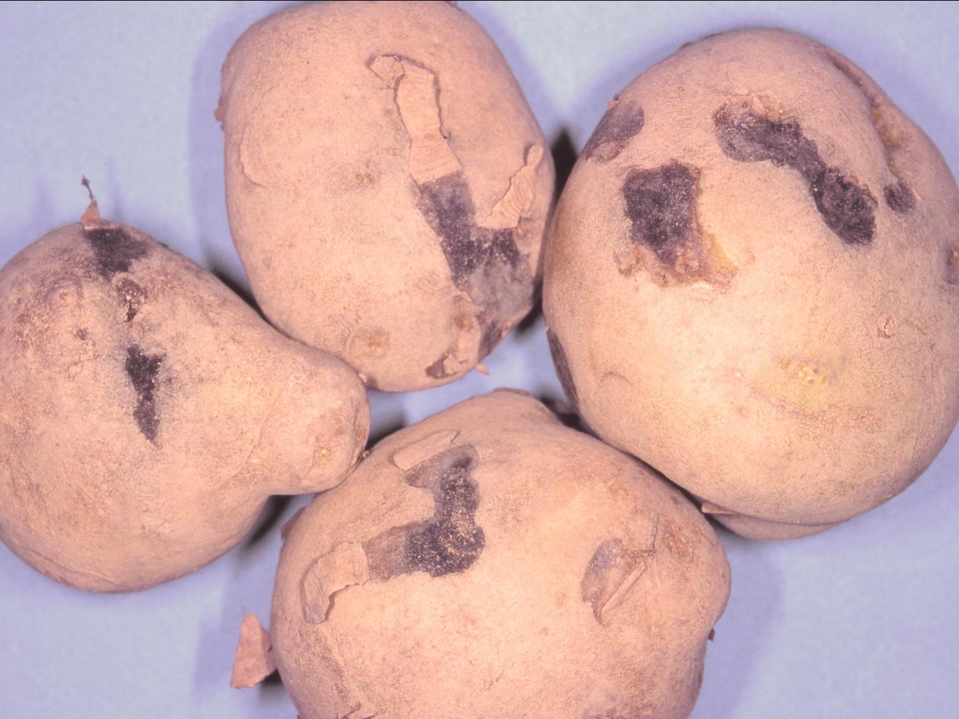 Description: Des tubercules de pomme de terre (cv 'QP 88085-04') provenant d’un entrepôt montrent la présence de quelques zones dépressives fermes, ovales à irrégulières, sur le périderme. Lorsque la pelure est soulevée, les tissus sont bruns et la dépression est peu profonde. Certaines lésions sont colonisées par un mycélium noirâtre. Ces zones dépressives sont liées à des meurtrissures ou blessures de pression qui se produisent en entrepôt lorsque la pression exercée par les tubercules les uns sur les autr… En savoir plus