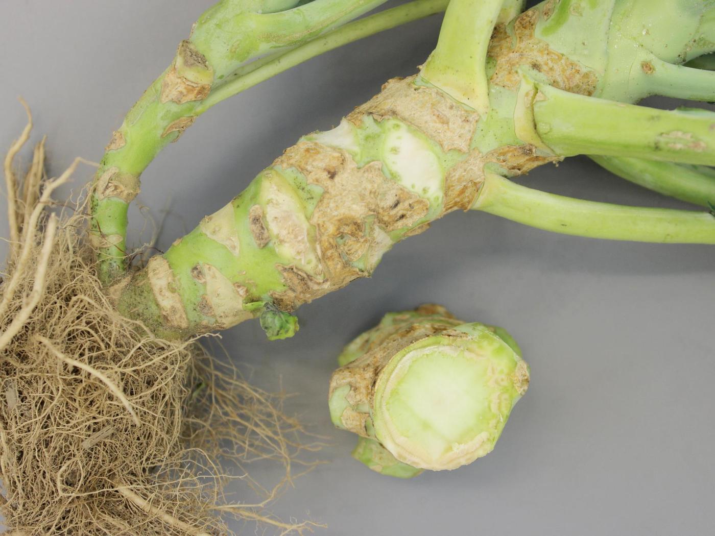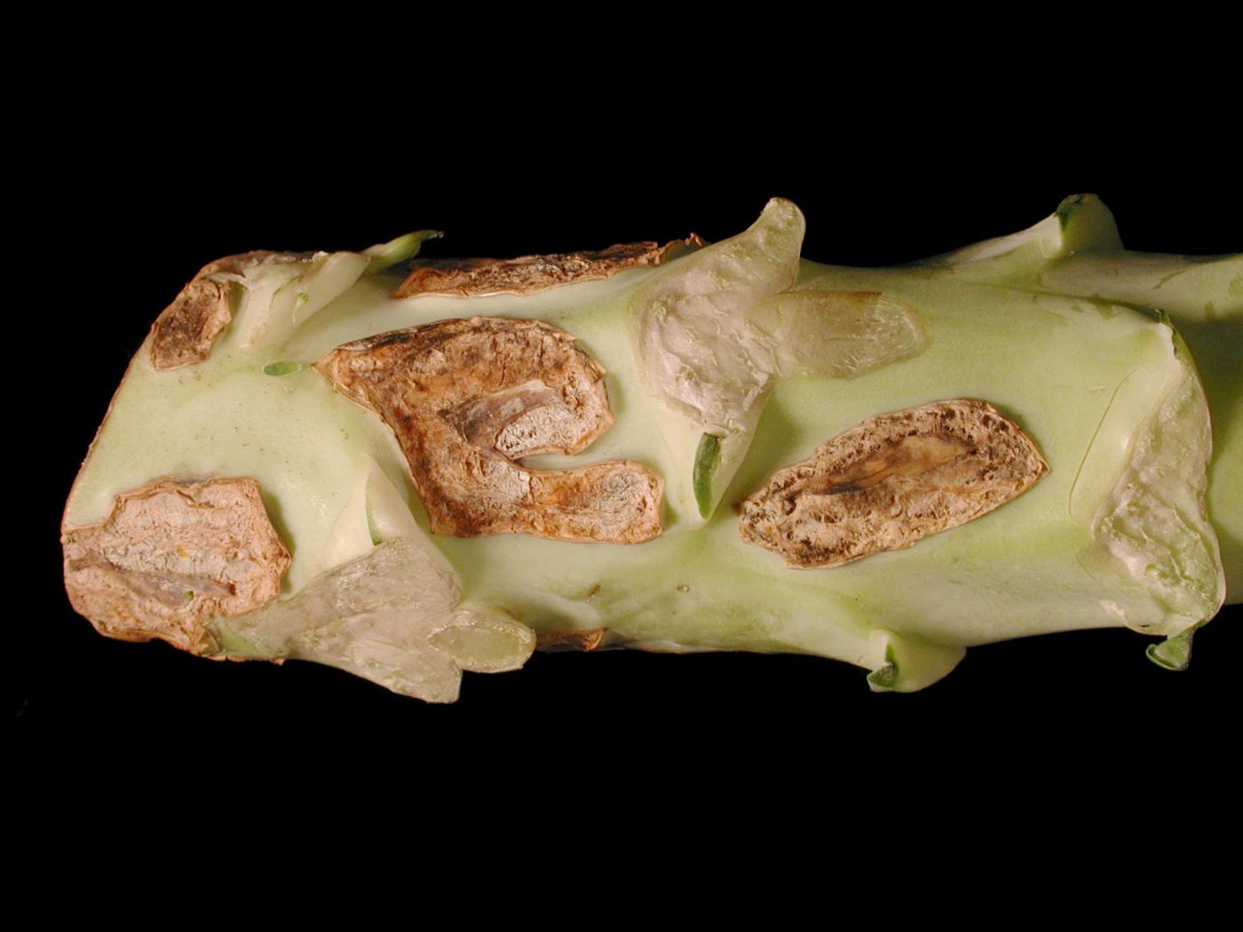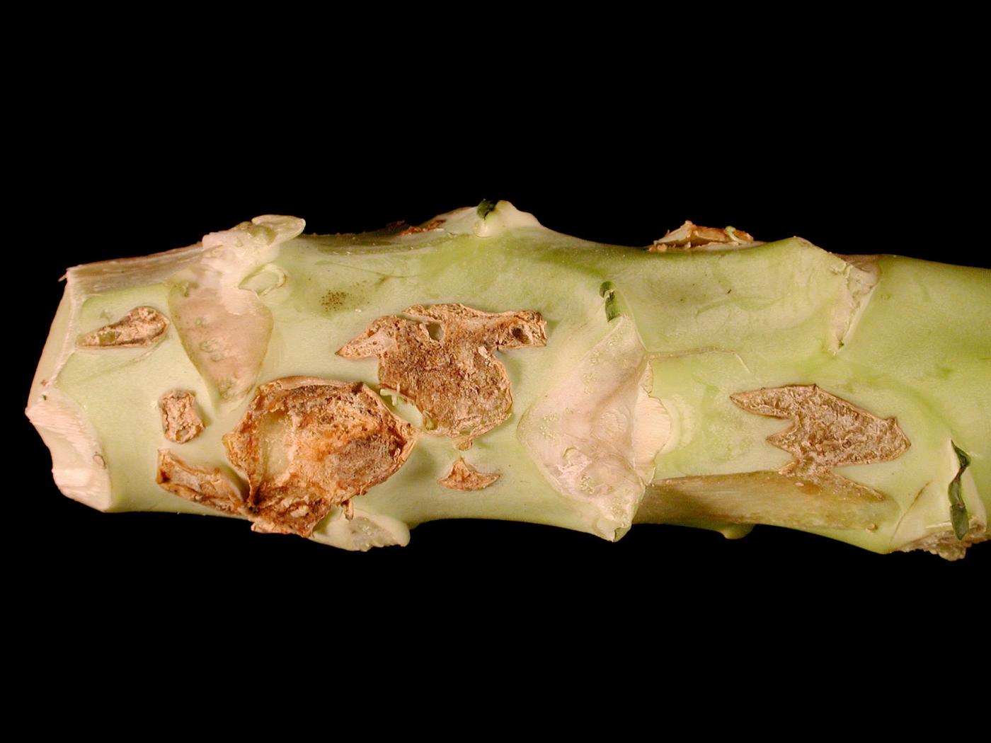Description: Sur l’épiderme d’une tige de brocoli provenant d’un champ, présence de tissus liégeux bruns ressemblant à des cicatrices. Les tissus commencent à se fendiller. À un stade plus avancé, la tige deviendra creuse et les tissus avoisinants seront bruns. Ces symptômes sont caractéristiques de la carence en bore.