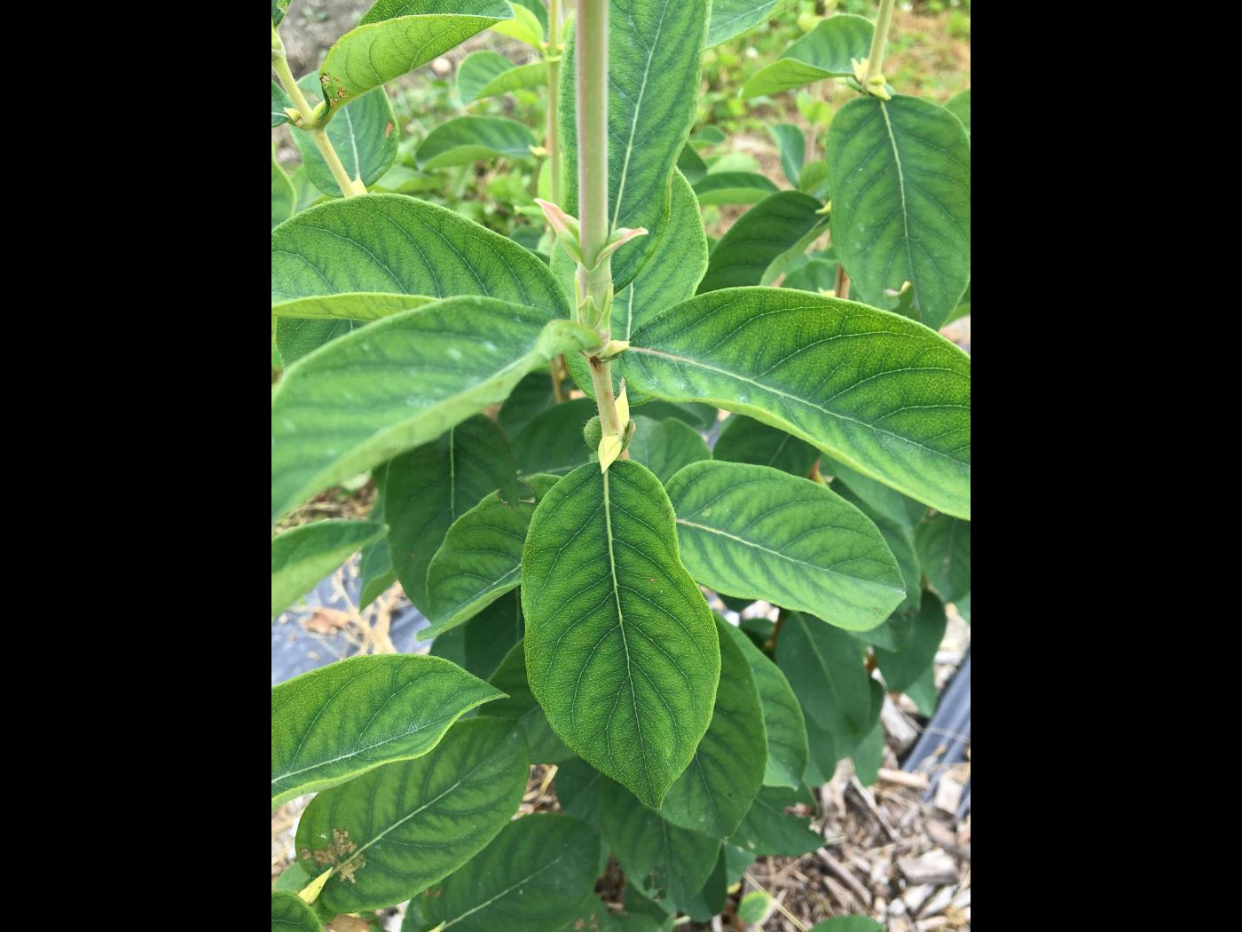 Description: Début du jaunissement internervaire sur les feuilles supérieures du camérisier, conséquence d'une carence en manganèse.