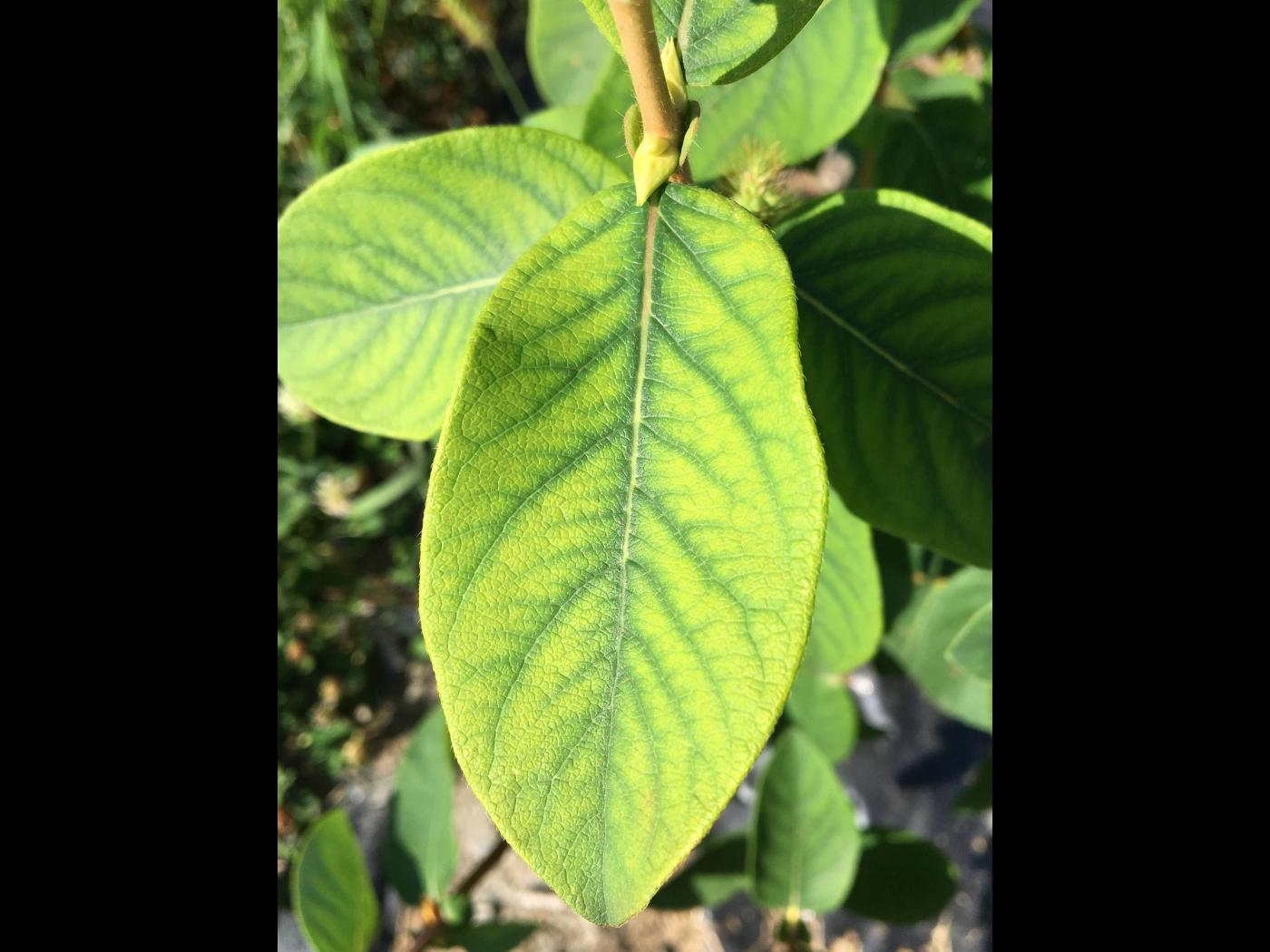 Description: Jaunissement internervaire causé par une carence en manganèse sur un camérisier.