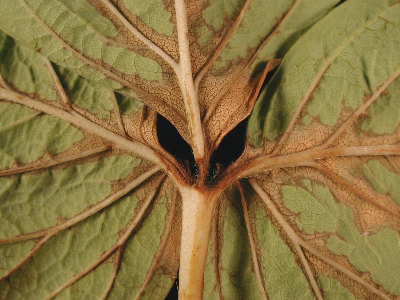Feuille et pétiole : se manifeste sur les feuilles matures sous deux formes soit (1) par le brunissement débutant à la base des folioles et progressant sur les nervures et les pétioles. Les tissus affectés sèchent. (2) par le rougissement uniforme de la marge des feuilles, anomalie de coloration visible sur les deux faces. Le rougissement progresse entre les nervures mais n’atteint jamais la nervure centrale. C’est le symptôme généralement observé sur les feuilles de fraisier. Nécrose à la marge des feuilles âgées. Le pétiole peut devenir nécrotique ce qui cause le noircissement des folioles.