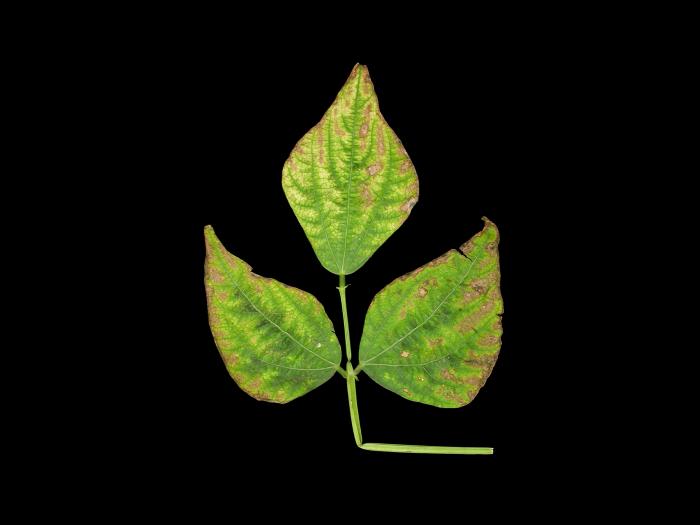 Feuille : jaunissement puis brunissement de la marge des vieilles feuilles sur les jeunes plants. Le jaunissement progresse entre les nervures et vers la base du limbe. Les feuilles atteintes courbent vers le bas et la marge brune s’enroule vers le haut. Les symptômes apparaissent généralement sur les vieilles feuilles, mais si la carence est sévère et que la plante est au stade de remplissage des gousses, les symptômes peuvent apparaître sur les jeunes feuilles.