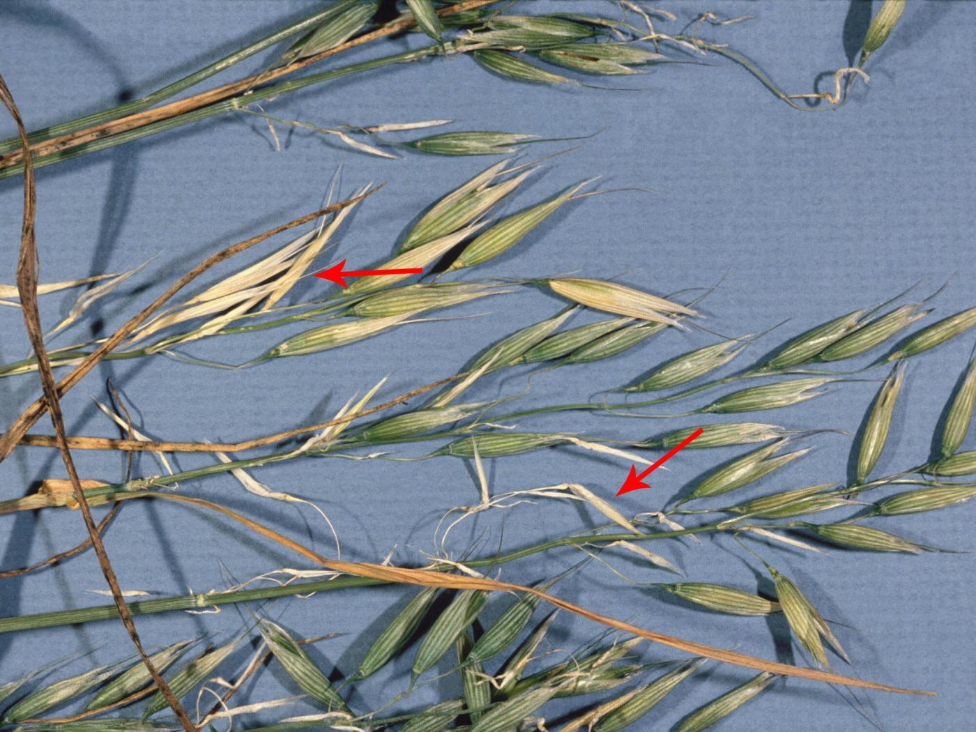 Description: Sur des inflorescences d’avoine ('Woodstock'), avortement et blanchiment de plusieurs fleurs (voir flèches) à la base des panicules. Il ne reste que les glumes. Les stress environnementaux sont responsables de la plupart des avortements (coulure) des fleurs chez l’avoine.