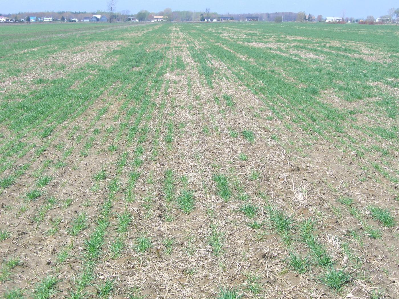 Lors d’un gel hivernal léger, les plants auront une croissance végétative presque normale et les symptômes se manifesteront surtout lors de l’épiaison qui requiert beaucoup plus d’énergie à la plante. Lors d’un gel hivernal sévère, le système vasculaire du collet peut être entièrement détruit et le plant ne débourrera pas ou très peu. Les dommages hivernaux sont souvent observés en premier sur les plants localisés sur des buttes ou dans des champs orientés Nord. Le gel hivernal est occasionnel, mais peut être sévère. Des pertes de vigueur, de rendement et de résistance face aux agents pathogènes sont observées sur les plants qui ont subi un gel hivernal. Au champ, les plants sont distribués de façon localisée et éparse.